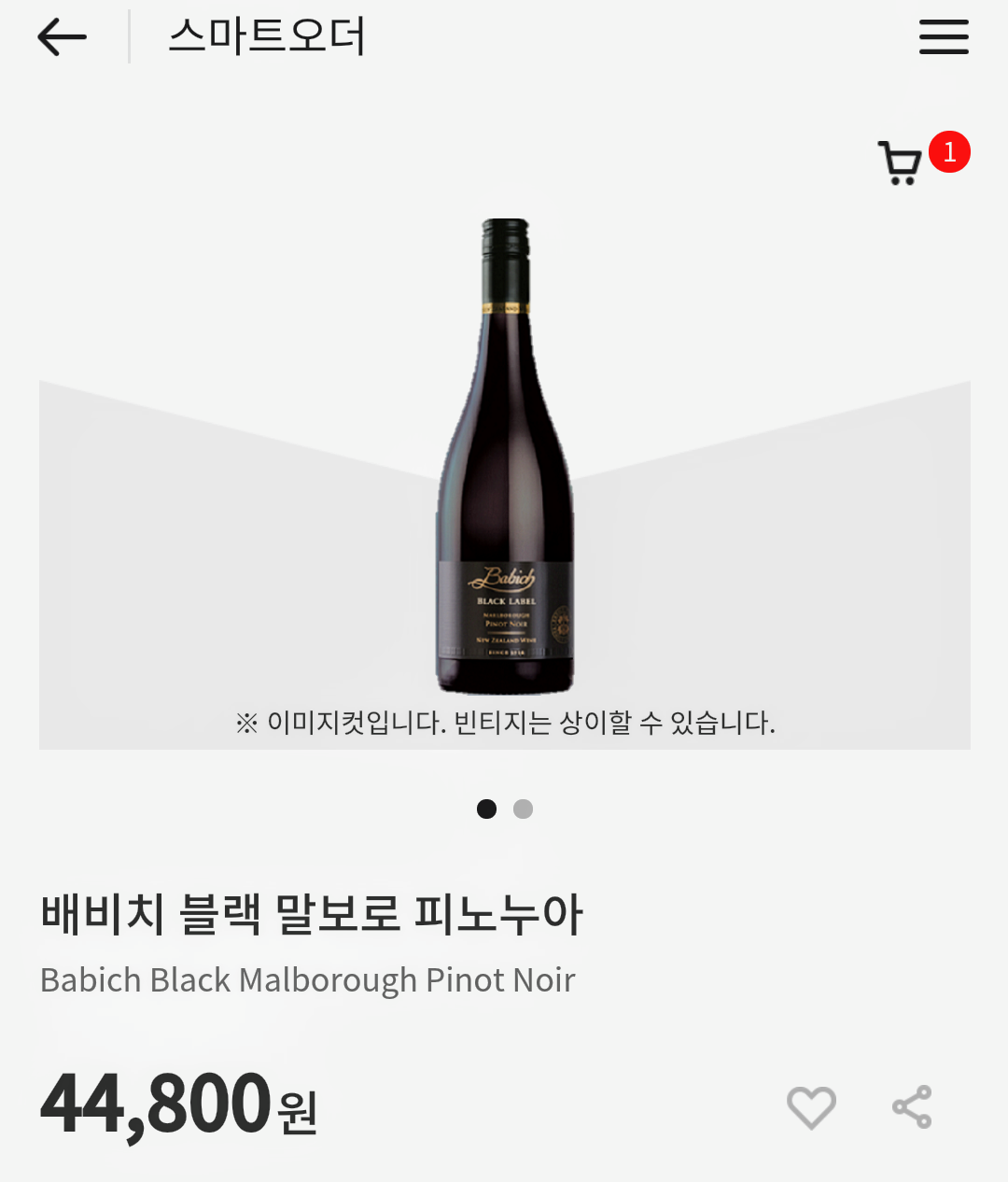 이마트 스마트 오더로 구매한 배비치 블랙 라벨 말보로 피노 누아(Babich, Black Label Marlborough Pinot Noir). 권장 소비자 가격은 7만 원대에 책정돼 있는 것 같다.