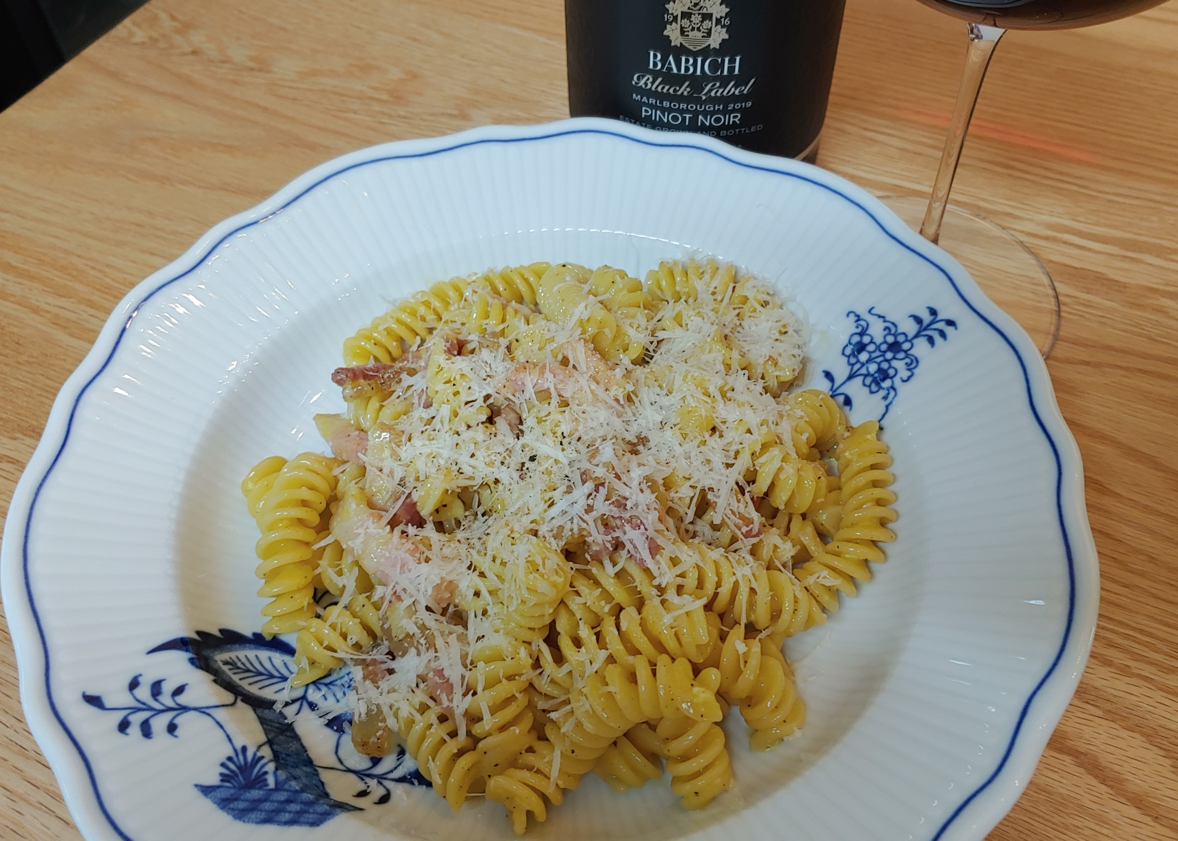 푸실리 면을 써서 만든 까르보나라 파스타와 함께. 소금집 관찰레와 베이컨을 반씩 섞고 베제카 올리브유와 페코리노 치즈, 계란과 후추만 써서 만들었다.