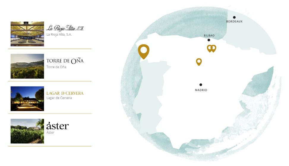 라 리오하 알타 홈페이지에 있는 지도. 왼쪽 상단에 크게 표시되어 있는 지역이 바로 리아스 바이사스다. 라 리오하 알타는 1988년 이곳에 라가르 데 세르베라(Lagar de Cervera)라는 와이너리를 세웠는데, 리아스 바이사스에서 가장 넓은 77ha의 알바리뇨 포도밭을 보유하고 있다. 라가르 데 세르베라가 보유한 포도밭은 미세기후(microclimate)의 영향으로 빨리 익어 신맛과 알코올, 풍미의 밸런스가 훌륭하다고. 2013년엔 최신 장비를 갖춘 새로운 시설을 오픈했다.
