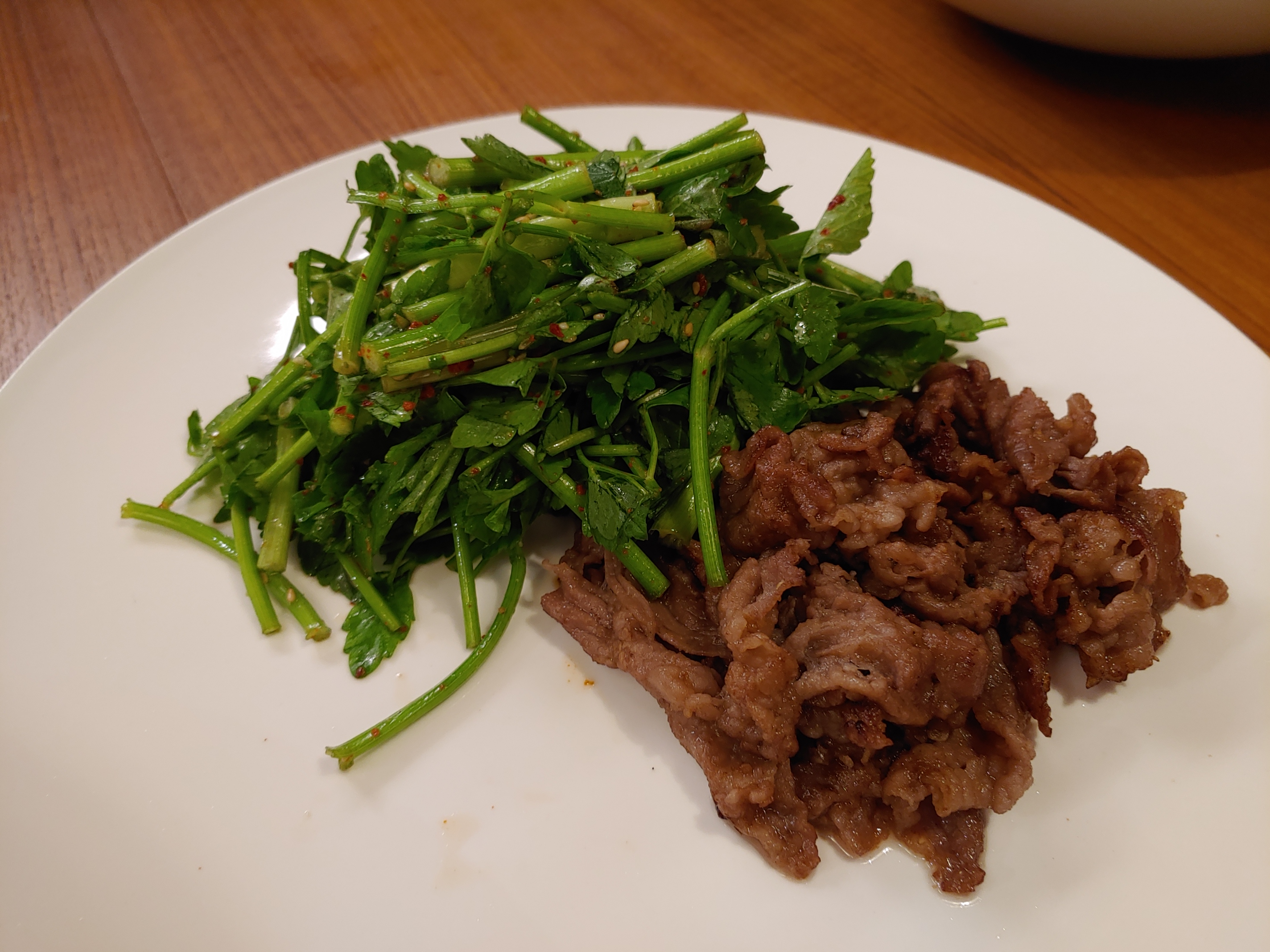나물무침을 곁을인 차돌구이. 와인을 레드로 바꿔야 할 타이밍이다.