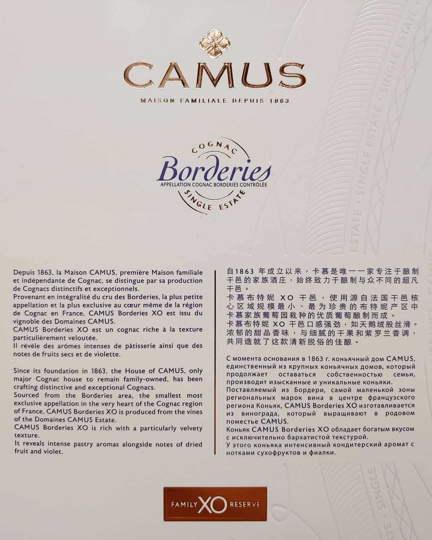 카뮤(Camus)는 1863년 설립한 코냑 하우스로, 5대에 걸쳐 가족 경영을 유지하고 있다. 카뮤 보르데리 XO는 벨벳 같이 부드러운 질감과 갓 구운 빵, 건과, 바이올렛 등의 리치한 풍미가 일품인 코냑이라고.