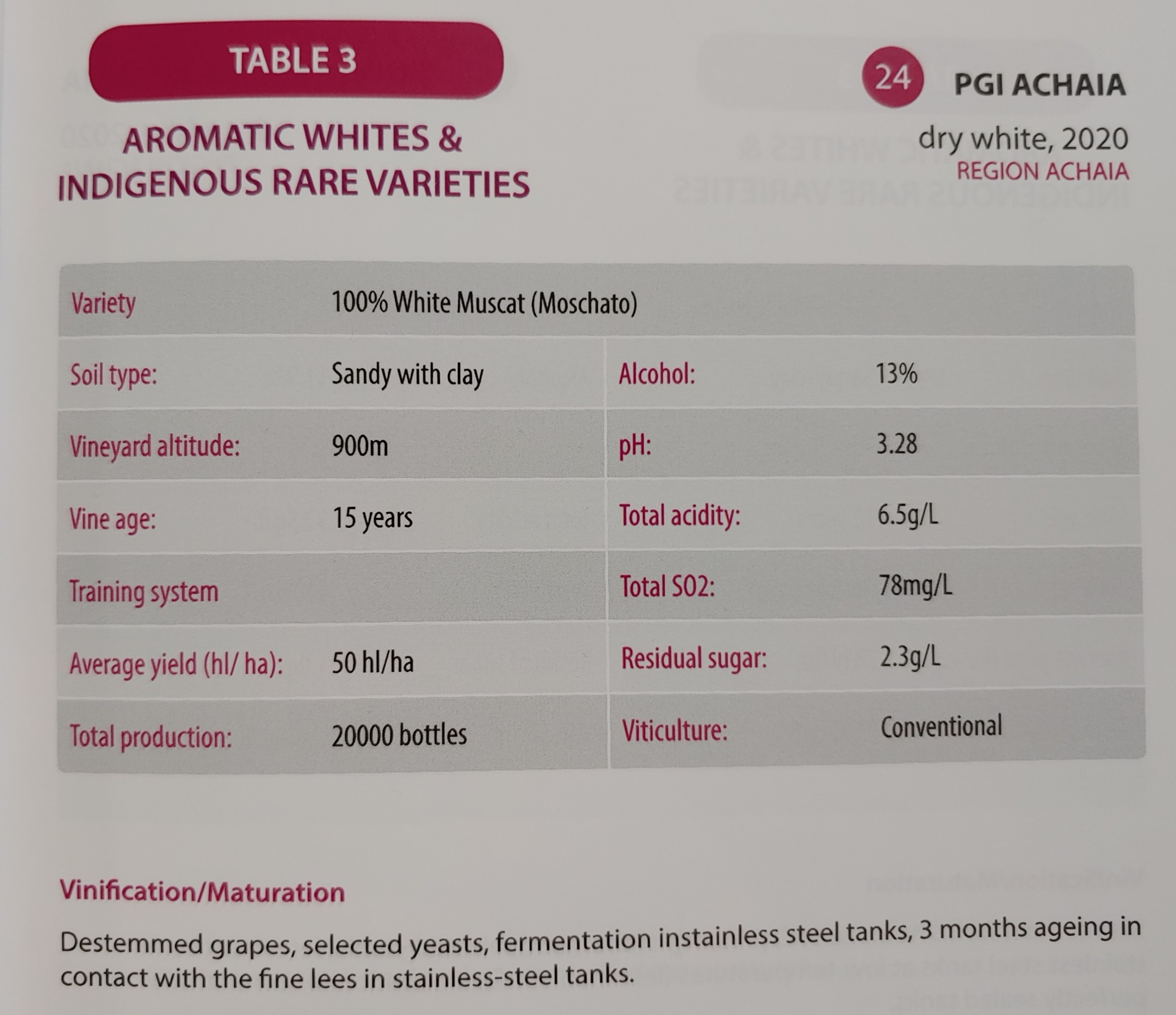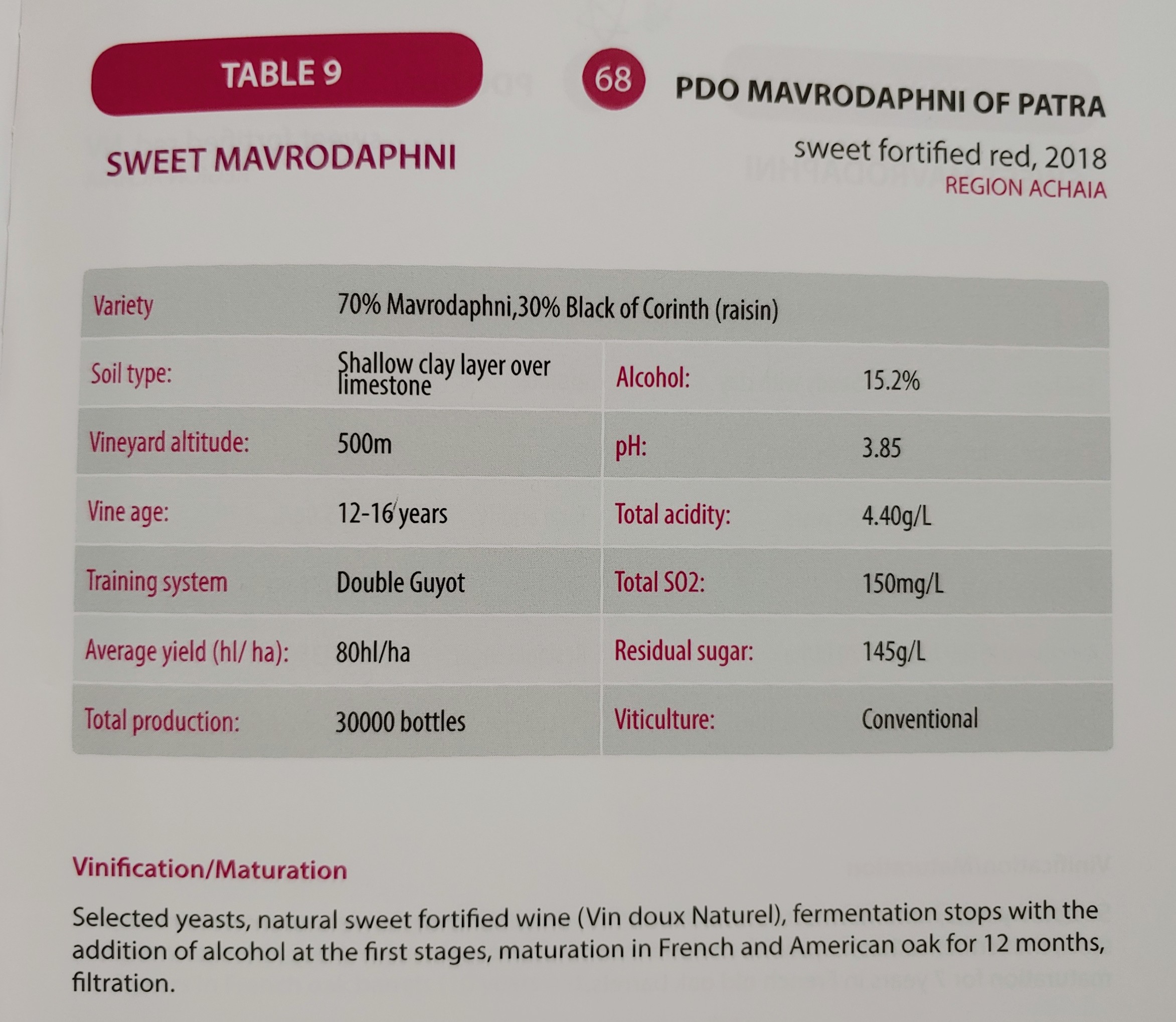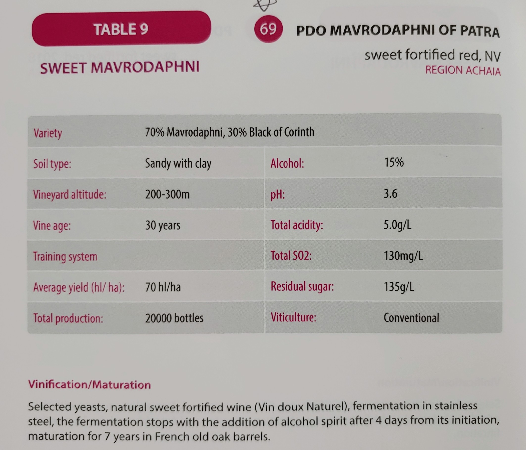 파트라스(Patras)의 준 산악지역에 조성된 선택된 포도밭에서 재배해 꼼꼼히 선별한 마브로다프네 70%, 블랙 코린스(Black of Corinth)를 사용해 효모 첨가 없이 3일 동안의 침용한 후 발효했다. 포도 증류주로 주정 강화해 프렌치 오크 배럴에서 12개월 숙성.