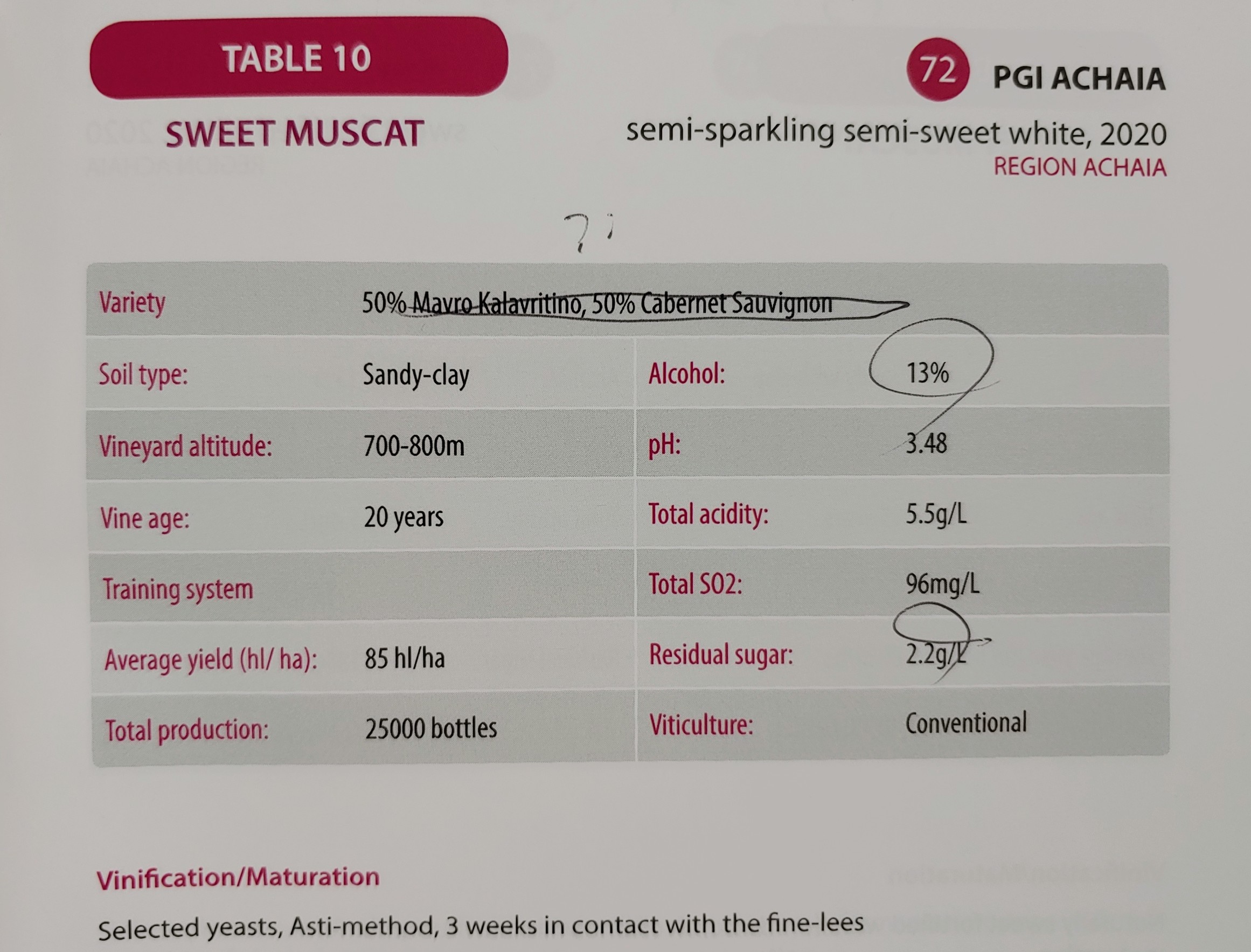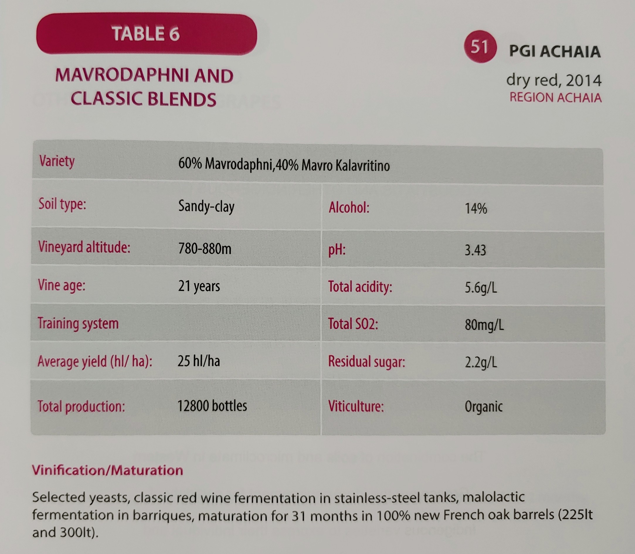 마브로다프네 60%에 마브로 칼라브리티노(Mavro Kalavritino) 40% 블렌딩. 스테인리스 스틸 탱크에서 이스트를 첨가해 알코올 발효, 바리크에서 젖산 발효를 진행한 후 31개월 동안 프렌치 오크 배럴(100% new)에서 숙성한다.