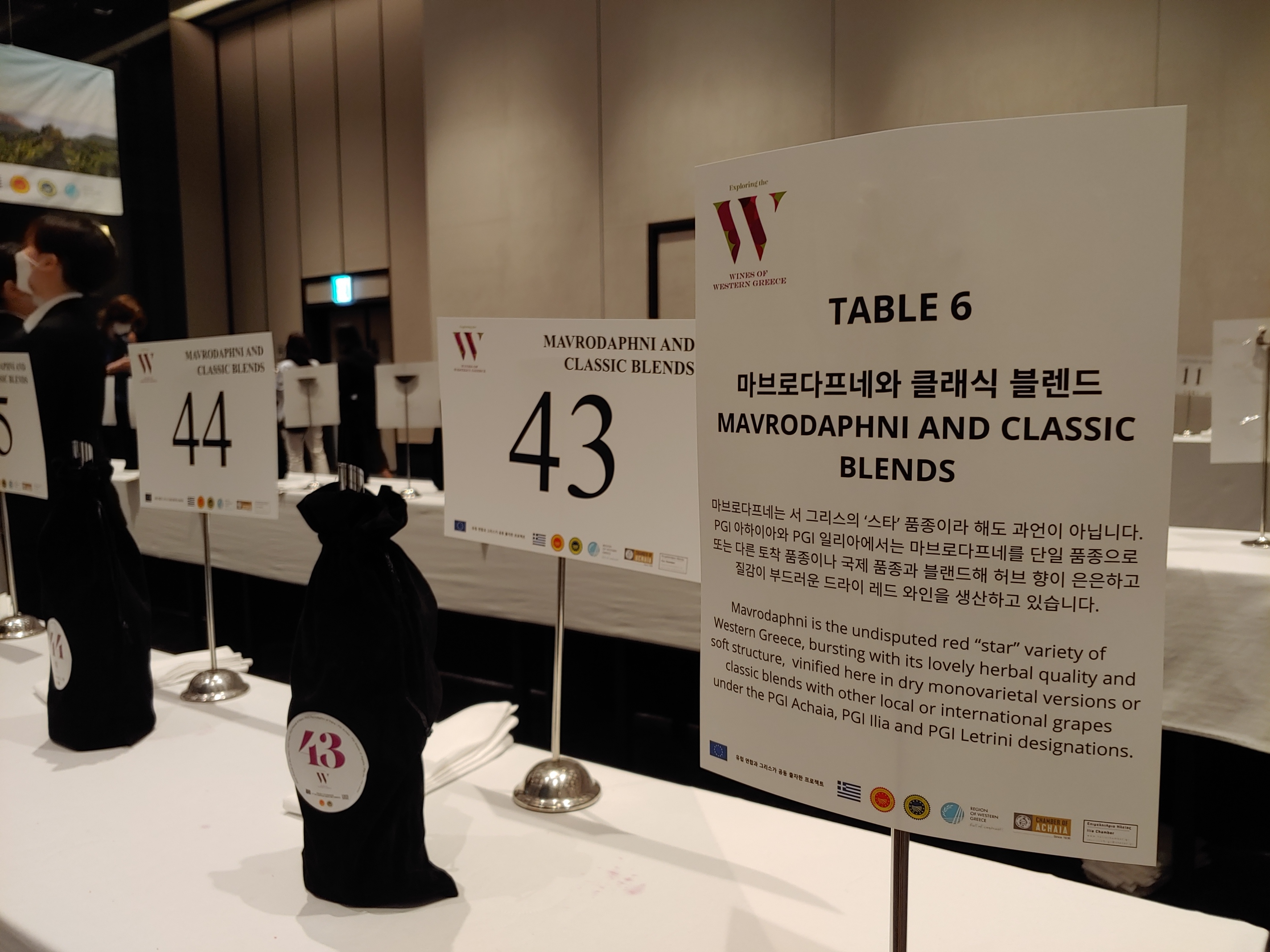 6번 테이블은 마브로다프네(Mavrodaphni)와 클래식 블렌드. 마브로다프네는 그리스 서부를 대표하는 레드 품종인데, 원래는 스위트한 주정 강화 와인을 만들 때 주로 사용하는 품종이다. 최근에는 드라이 와인을 선호하는 세계적 트렌드에 따라 드라이 와인으로도 많이 양조하는 추세라고 한다. 시간 관계상 건너뛰었다가 전시장에서 만난 지인의 추천으로 두 종 정도 테이스팅했는데 상당히 인상적이었다. 이 테이블도 제대로 했어야 했다는 아쉬움이 번지는 순간.