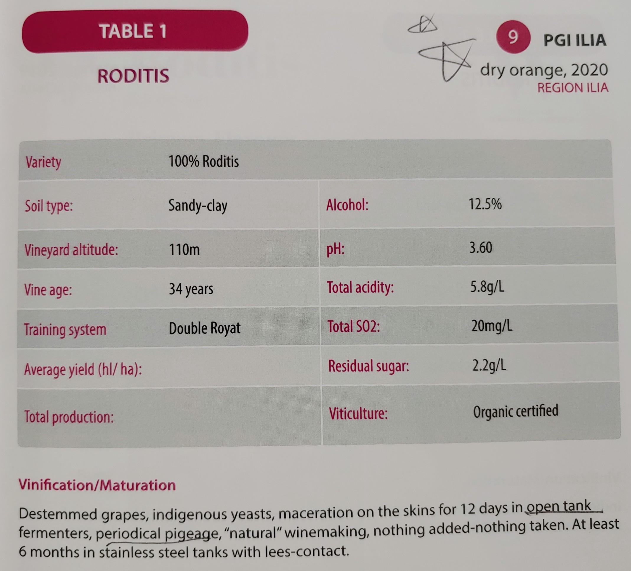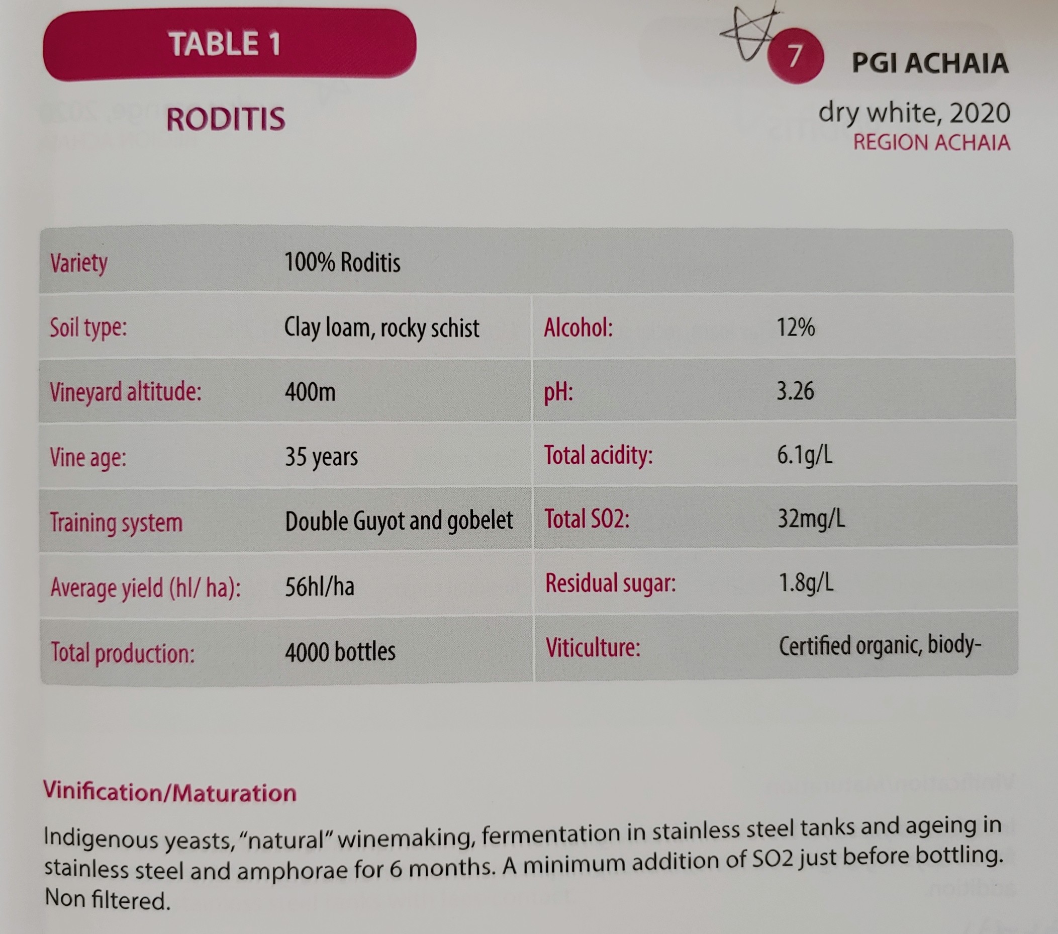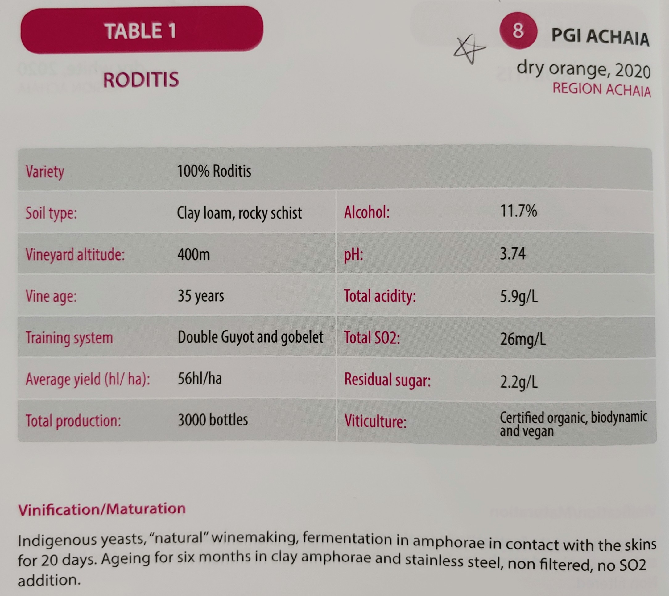라고르티(Lagorthi)라는 생소한 품종. 줄기를 제거하지 않고 직접 압착하여 효모 첨가 없이 70%는 스테인리스 스틸 탱크에서, 30%는 암포라에서 발효한다.