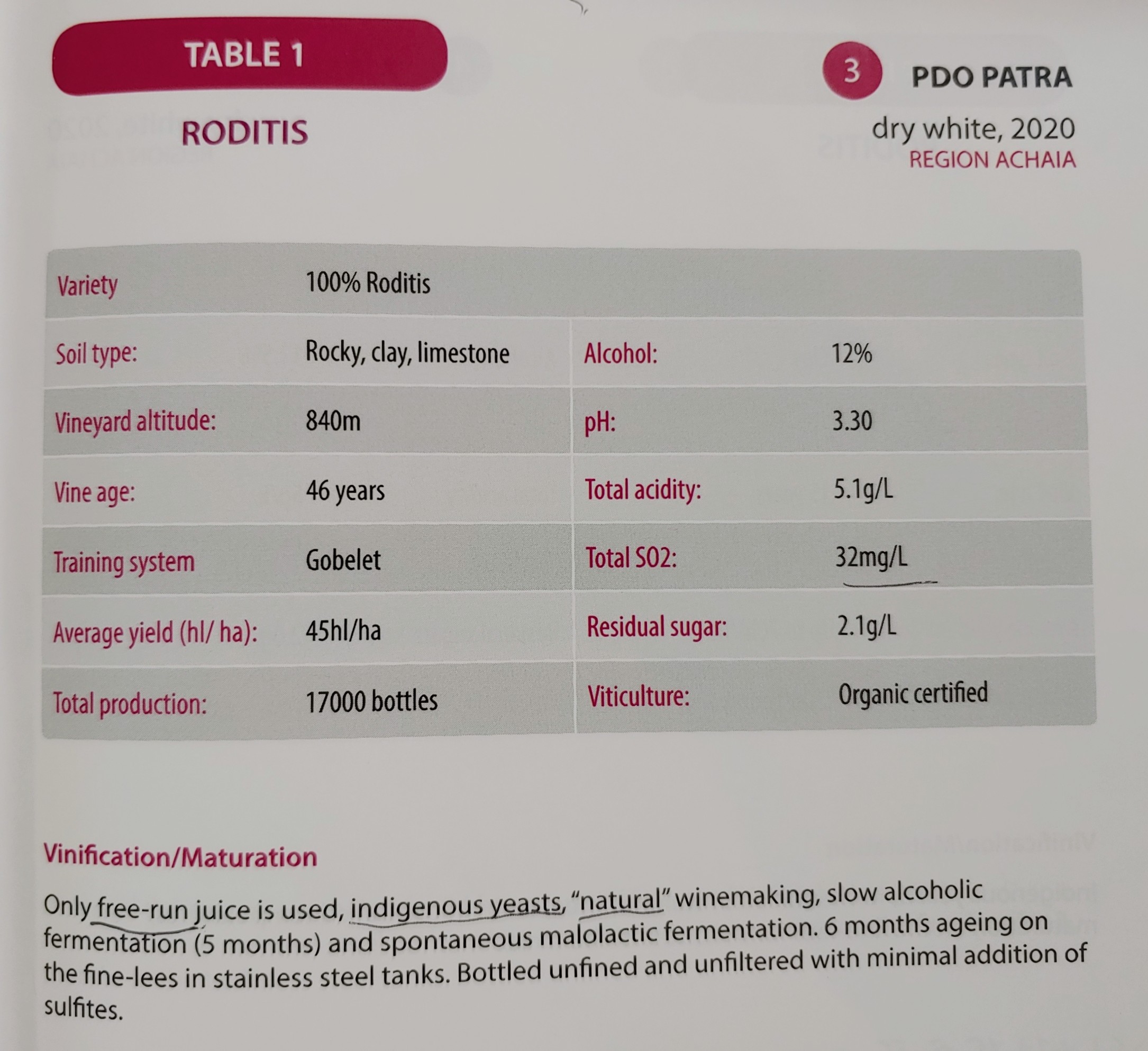 로디티스(Roditis)는 '서 그리스 포도의 왕'으로 불리는 품종으로, 과일향이 풍부한 부드러운 와인부터, 숙성 잠재력이 뛰어나고 미네랄이 느껴지는 와인까지 다양한 스타일의 와인을 생산한다. 가뭄에 강하고 생장력이 좋아 수확량 또한 많은 편이지만, 각종 질병에 취약해 주의를 요한다. 또한 너무 수확량이 많으면 저품질의 평범한 와인이 생산되는 경향이 있다. 반대로 적절한 클론을 재배하고 수확량을 잘 조절해 양질의 포도를 수확한다면, 그 품질 잠재력은 상당한 수준이다. 특히 해발 고도가 높은 지역에서 재배한 로디티스의 품질은 상당한 수준이라고