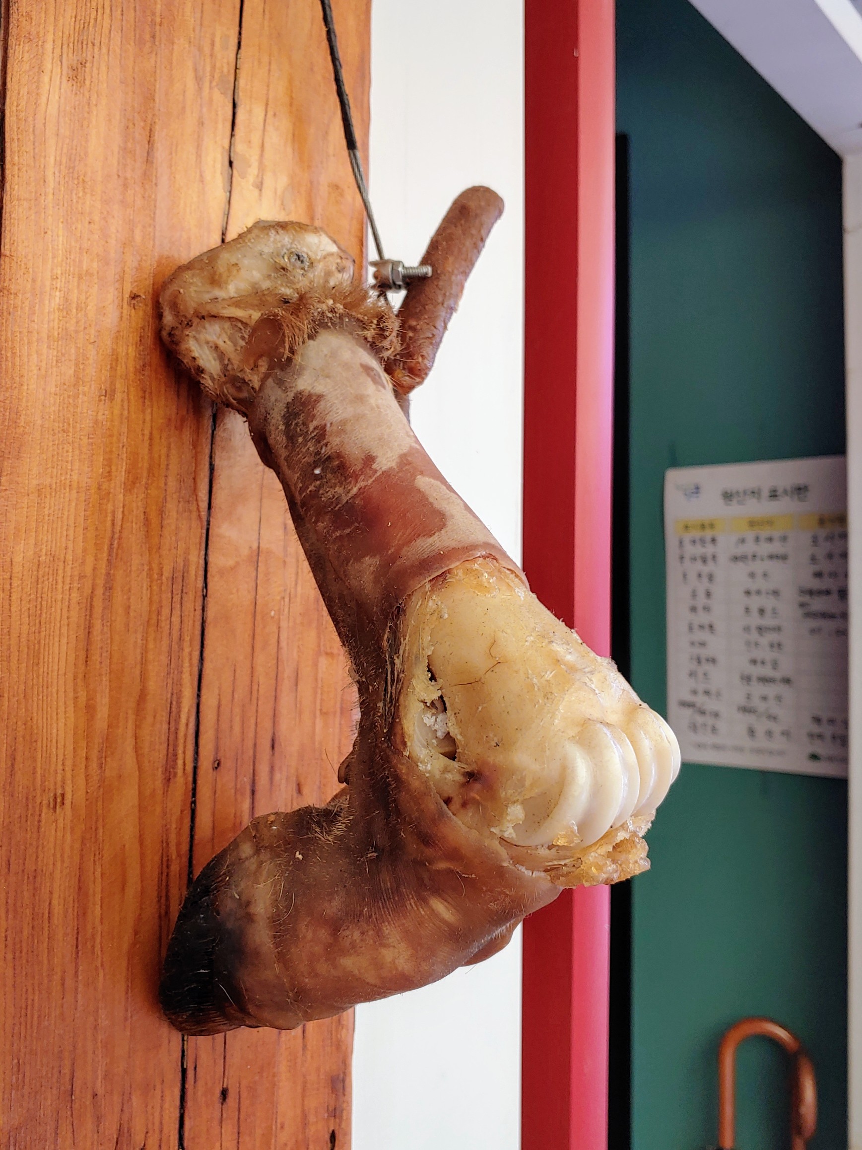 입구 근처 벽에 걸려있는 족발이 포스 무엇... 요거 말고도 거칠게 긁어 살이 좀 붙어 있는 다른 뼈도 몇 개 걸려있었... ㅎㄷㄷ