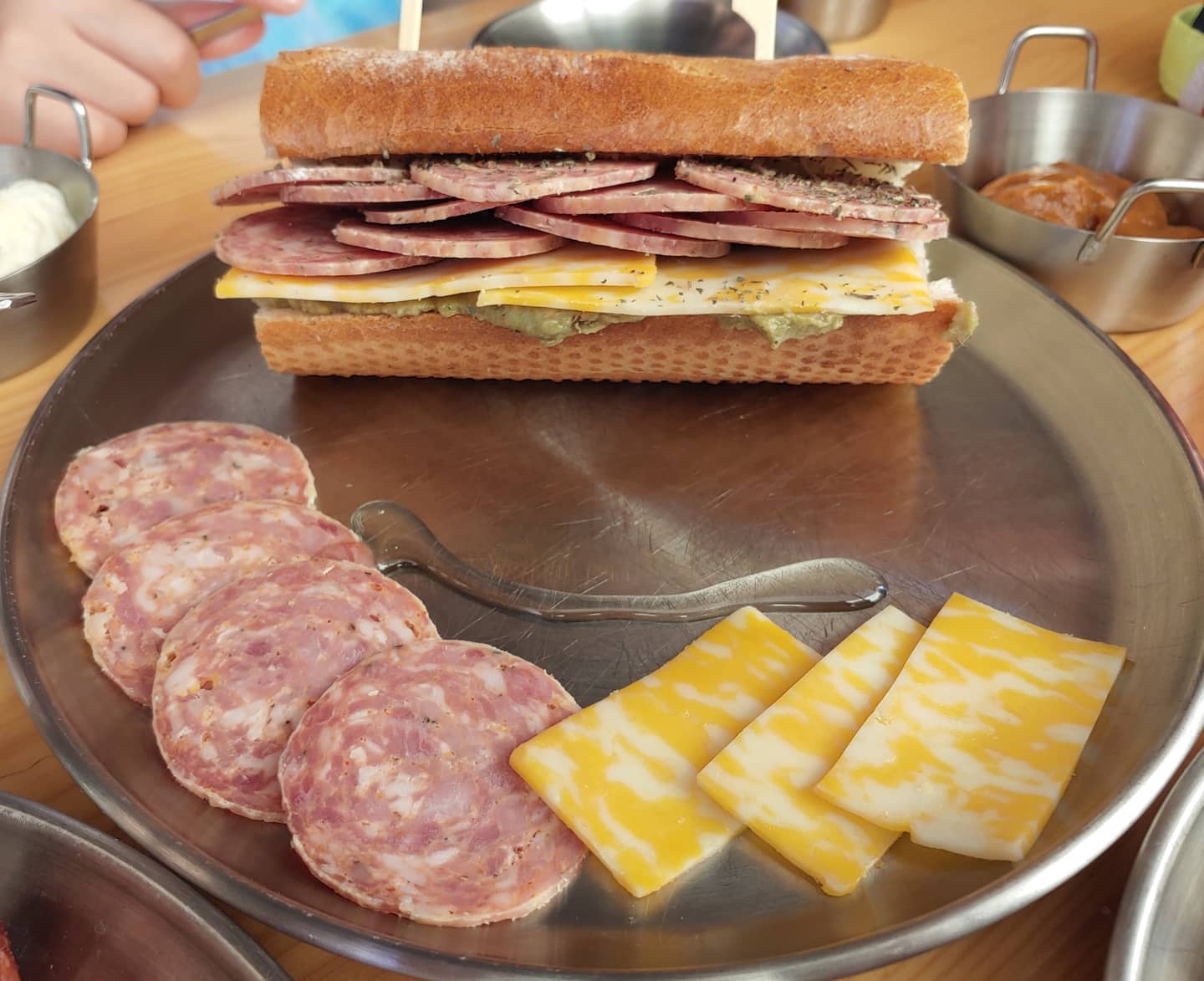 살라미 샌드위치. 잠봉 뵈르보다는 사이즈가 살짝 작다. 그래서 잠봉 뵈르는 1~2인용인데, 살라미 샌드위치는 1인용이라고 표시하셨나 보다. 그래도 앞에 살라미와 치즈, 꿀을 추가로 플레이팅 해 주셨다.