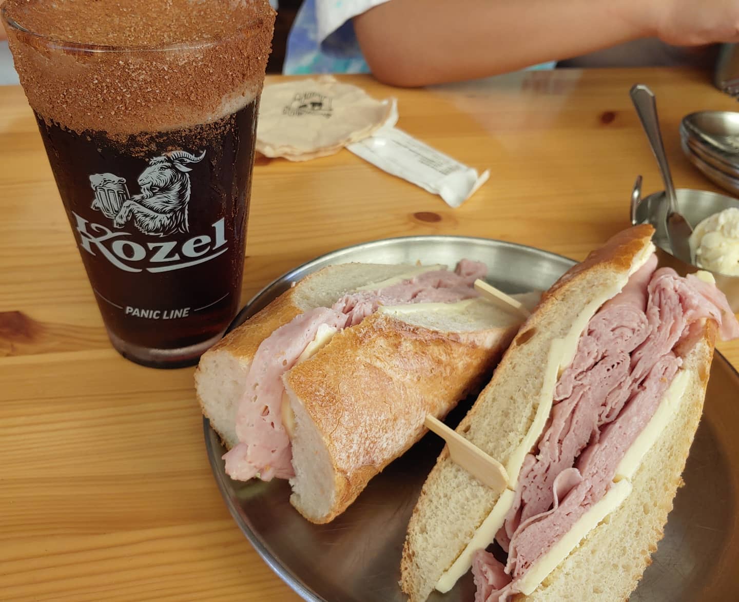 사람이 네 명이니까 잠봉 뵈르, 살라미 샌드위치, 킬바사 소세지 플래터에 콜라 1, 사이다 1, 코젤 다크 한 잔 주문.
