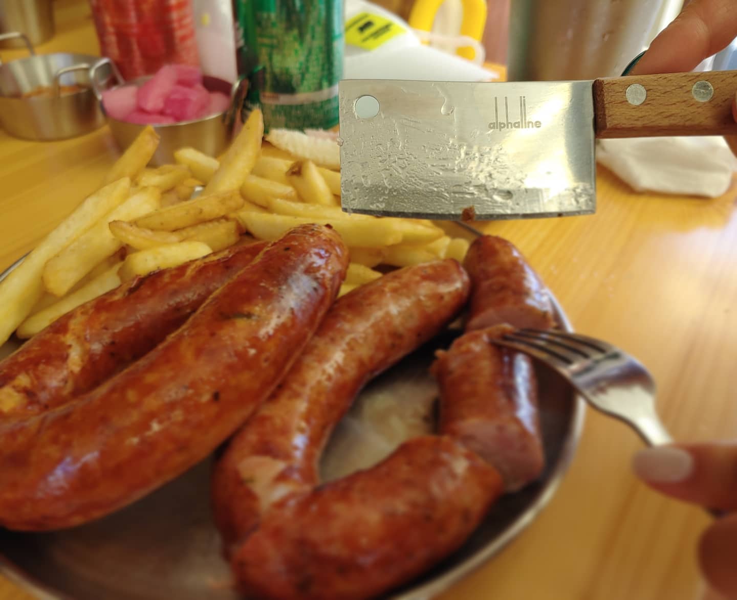 넘나 귀여운 칼. 뭐라도 썰어주고 싶은 비주얼 ㅋㅋㅋㅋㅋ 소시지는 일반, 치즈, 매운맛 중 선택할 수 있는데 치즈 안 먹는 아들냄을 위해 일반과 매운맛을 시켰다. 매운맛은 엄청 매운 건 아니지만 제법 매콤하니 아이를 동반한다면 주의 필요. 그래도 맛있어서 깨끗하게 싸악 먹었다.