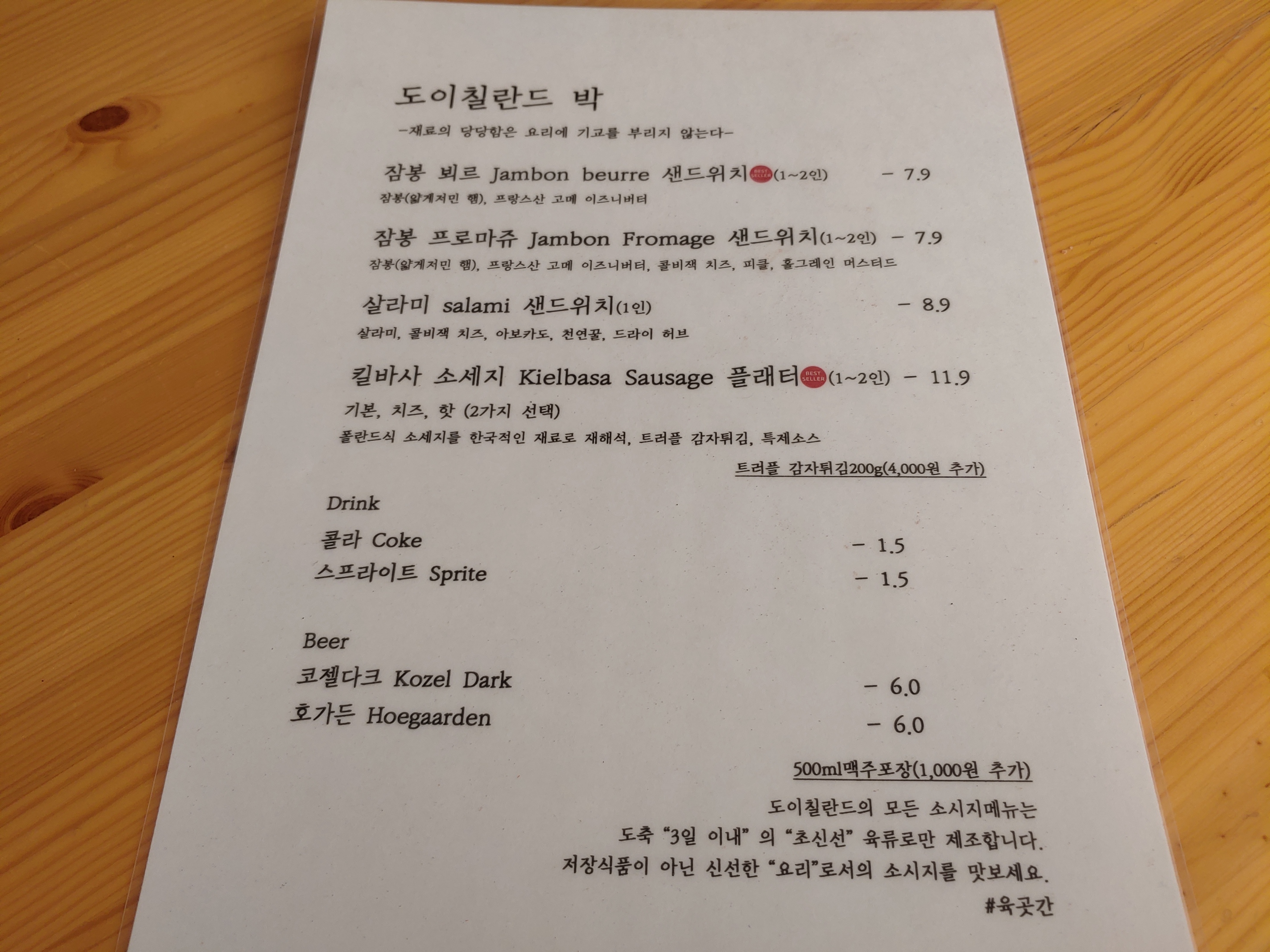 도이칠란드 박은 음식점이기도 하지만, 직접 만든 수세 소시지를 파는 가게이기도 하다. 맛이야 직접 확인했으니 더 말할 필요 없지만, 가격은.... 정말 훌륭하다. 몇 개 집어오고 싶었지만, 첨가물을 쓰지 않아 며칠 내에 다 먹어야 한다고 해서 눈물을 머금고 후퇴했다.