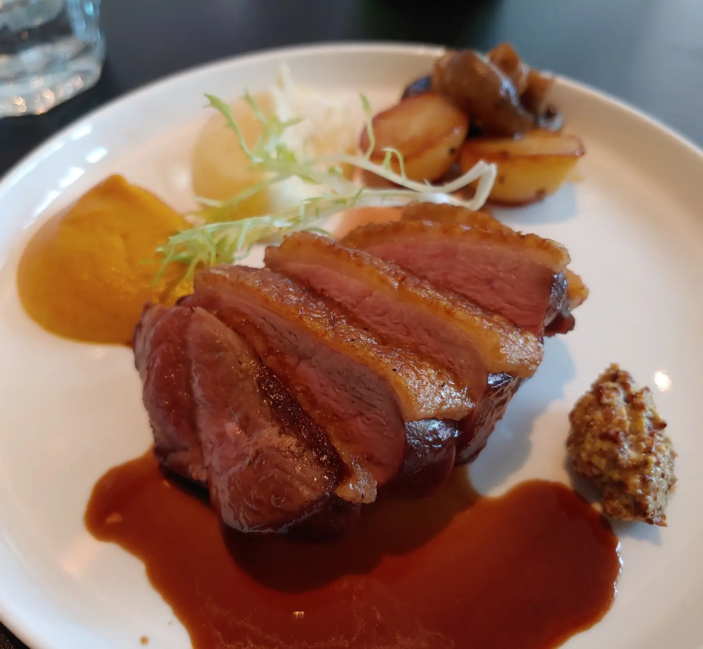 동행인이 시킨 제주 오리 가슴살 스테이크. 해외여행 등에서 경험한 오리 스테이크는 대부분 피가 뚝뚝 떨어질 정도의 레어였는데 위트 레이즌은 웰던에 가까운 미디엄 웰던으로 낸다. 아마도 그게 대부분의 한국 고객 취향일 듯. 동행인도 맛있게 다 비웠다.