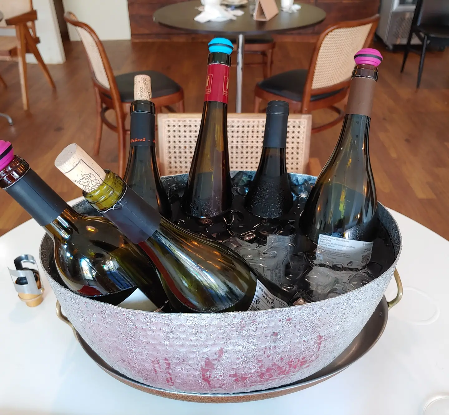 입구에 쌓여 있는 글라스 와인용 와인들. 위트 레이즌의 강점은 저렴한 가격의 점심 코스 메뉴, 그리고 내추럴 와인 중심의 다양한 글라스 와인이다. 메뉴, 취향, 기분 따라 글라스 와인을 페어링 할 수 있다.