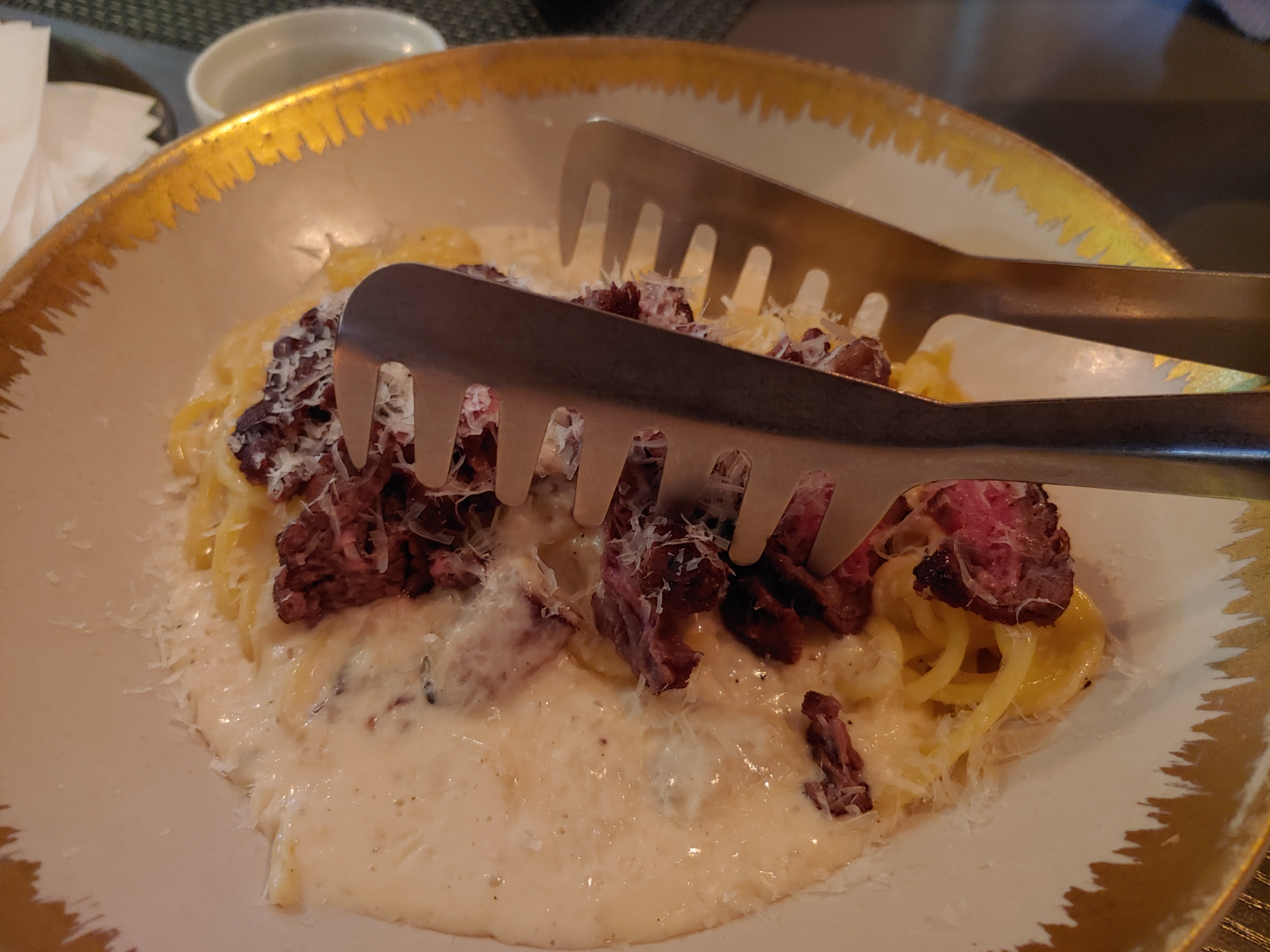고르곤졸라 비스테카. 고르곤졸라 치즈를 넣은 크림 소스 파스타 위에 한우 채끝을 올렸다. 잘 삶은 면에 고르곤졸라 향이 매우 적절하게 드러난다. 꼭 시켜야 할 메뉴.