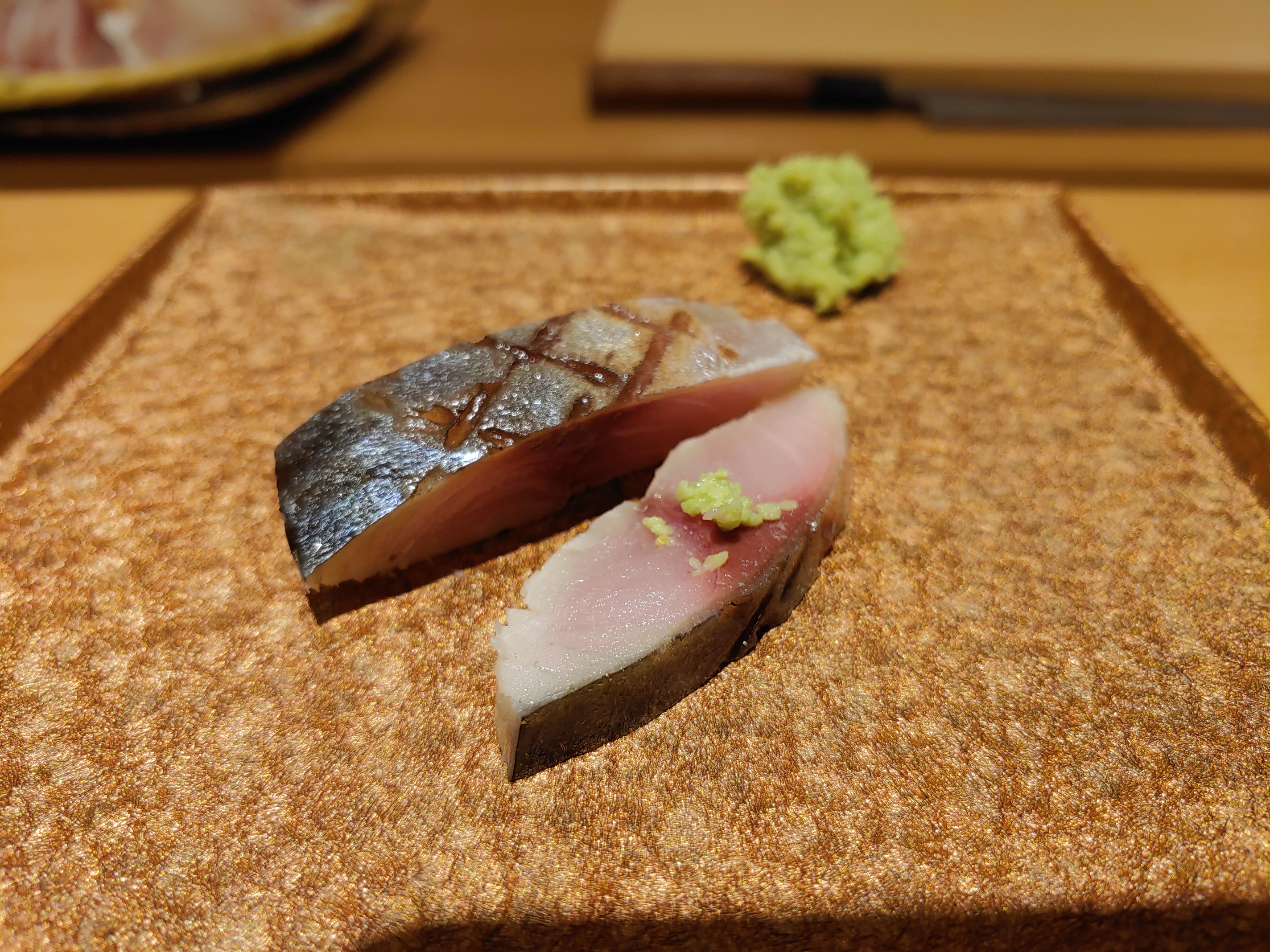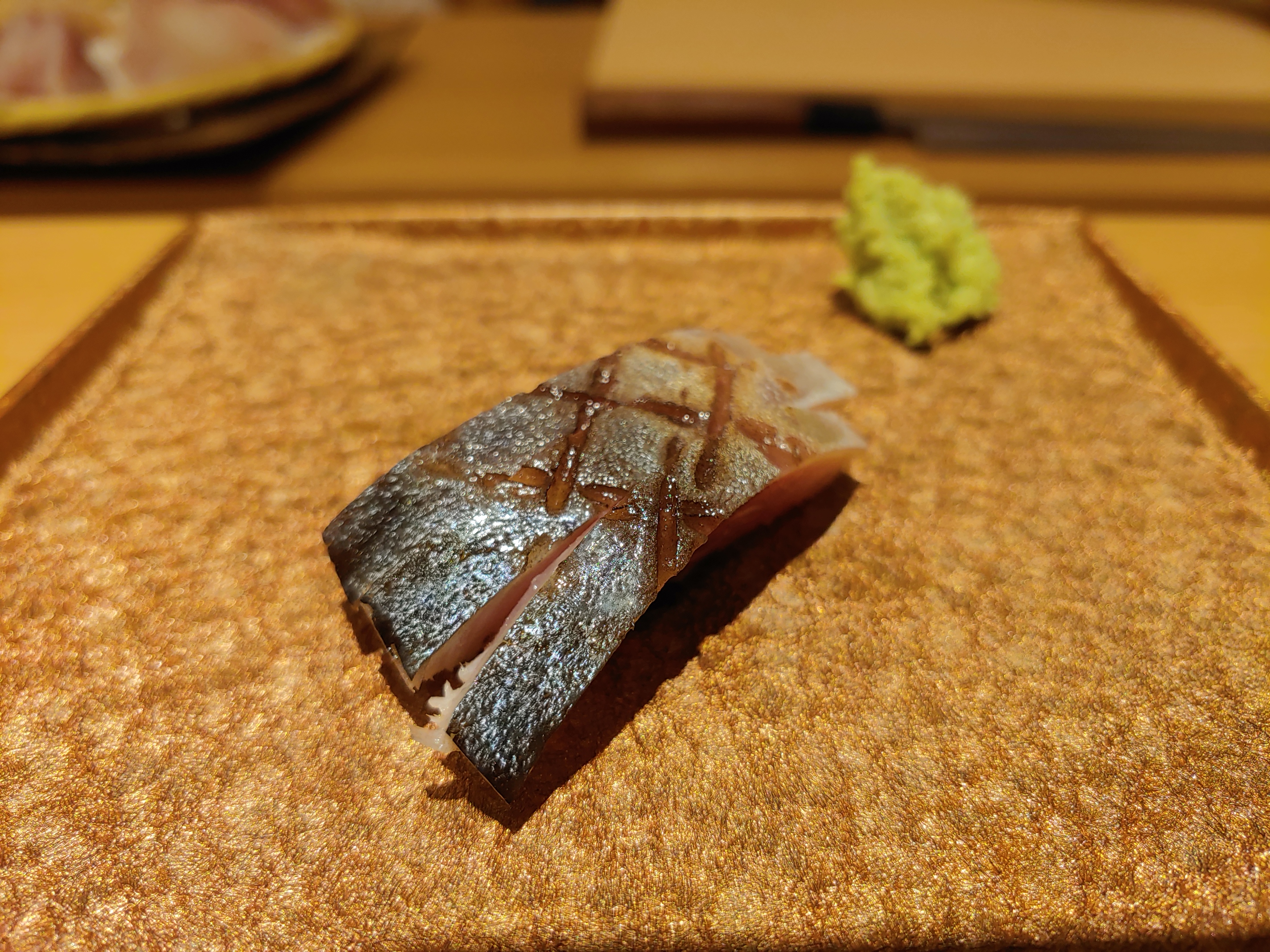 야부리한 시메사바. 등 푸른 생선 특유의 바다내음과 고소한 맛이 폭발한다. 와사비를 조금 올려서 먹으면 핵꿀맛.