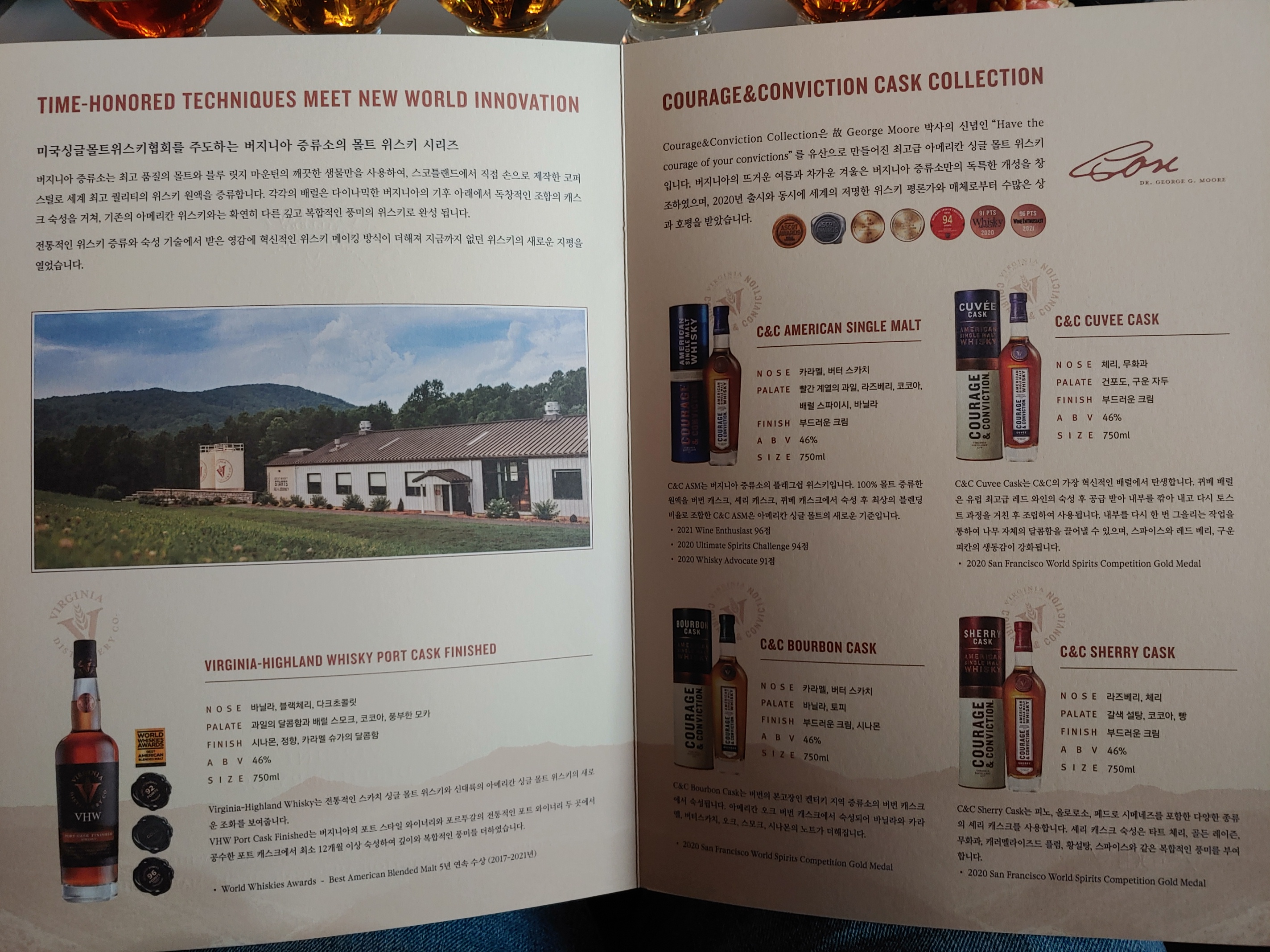 일단 두 번째 위스키인 Courage & Conviction 시리즈부터 차례로 시음하고, 맨 왼쪽의 VHW는 스코틀랜드 하이랜드에서 증류한 싱글 몰트 위스키와 버지니아 디스틸러리의 싱글 몰트 위스키를 블렌딩한 독특한 위스키이므로 가장 나중에 시음했다.