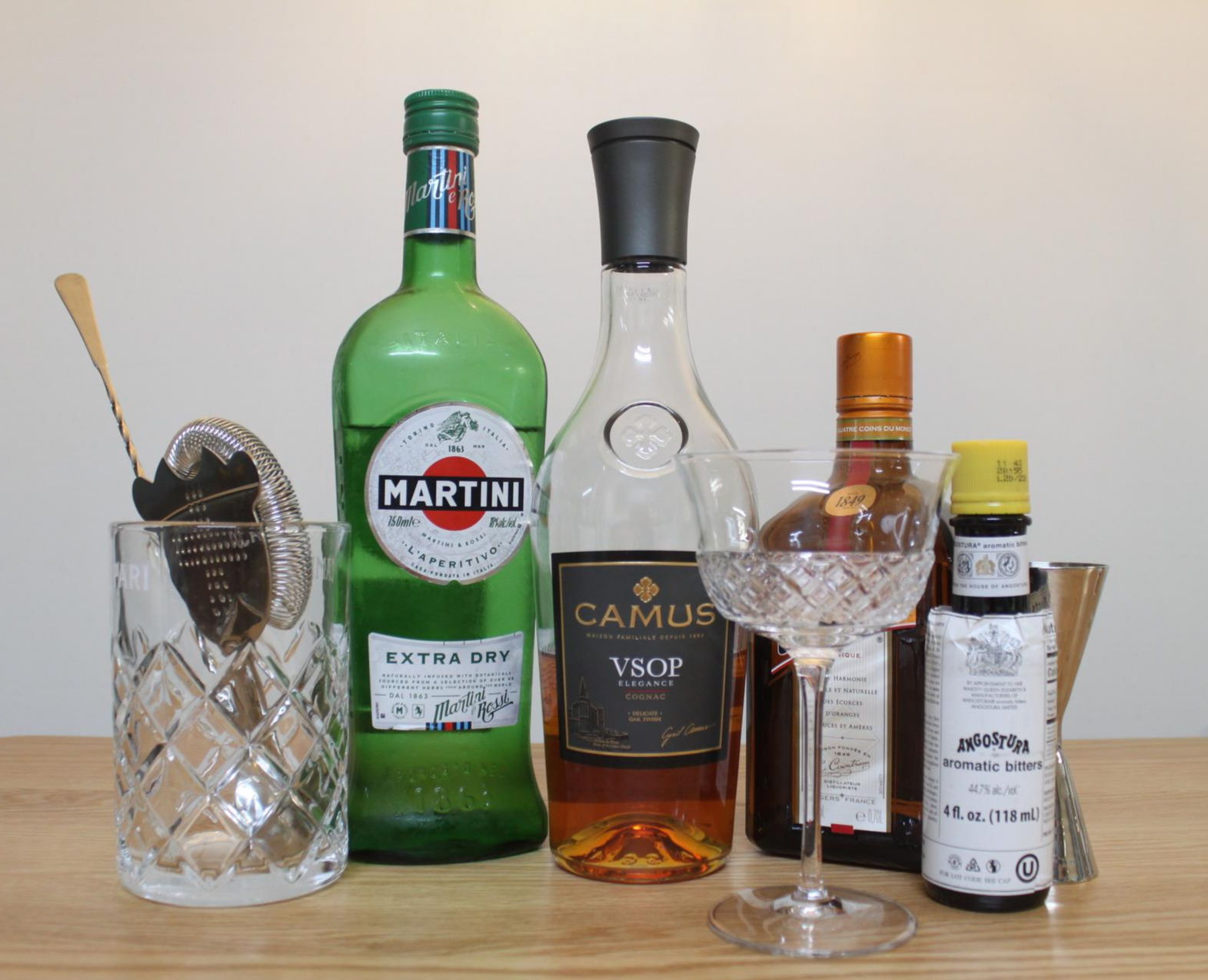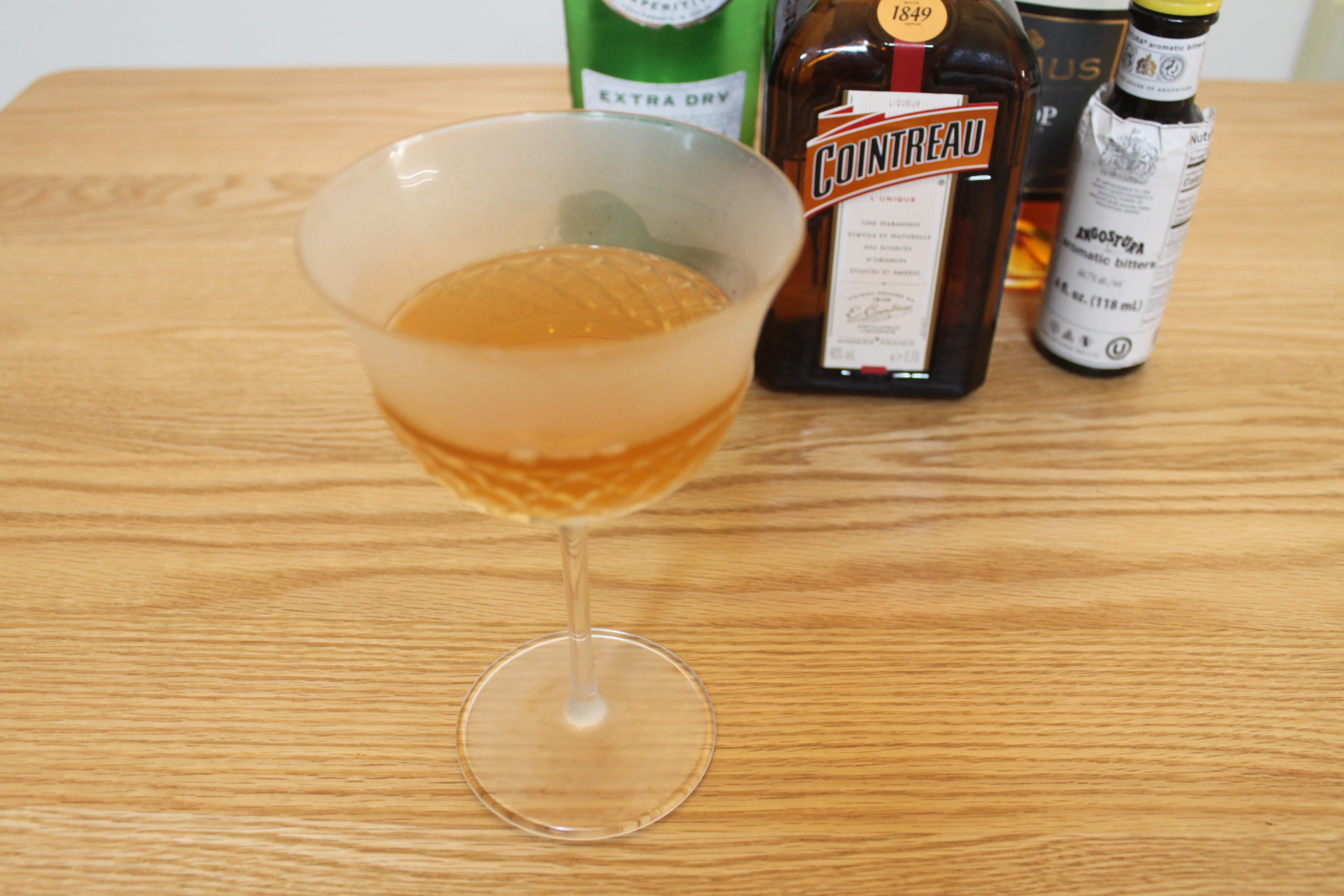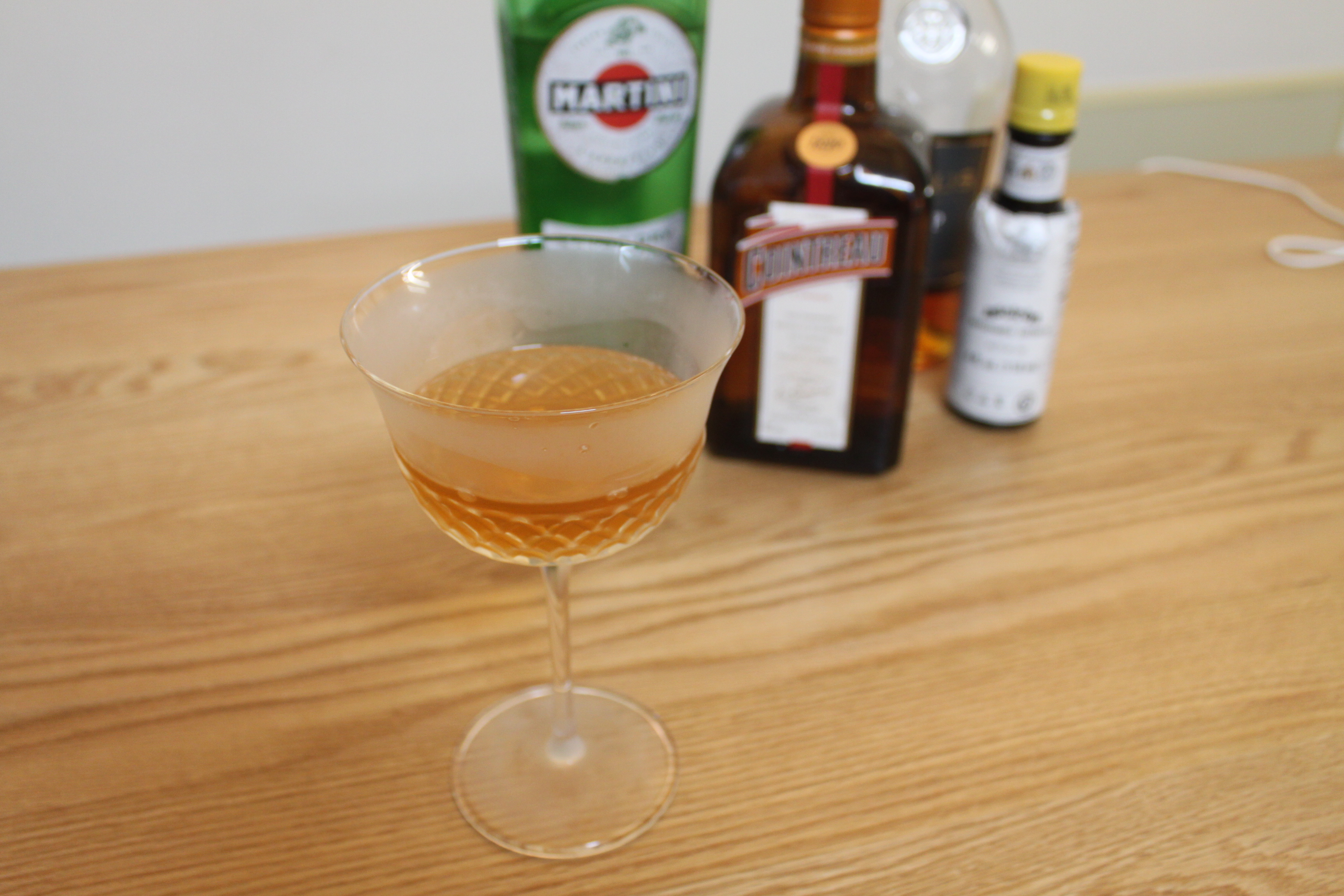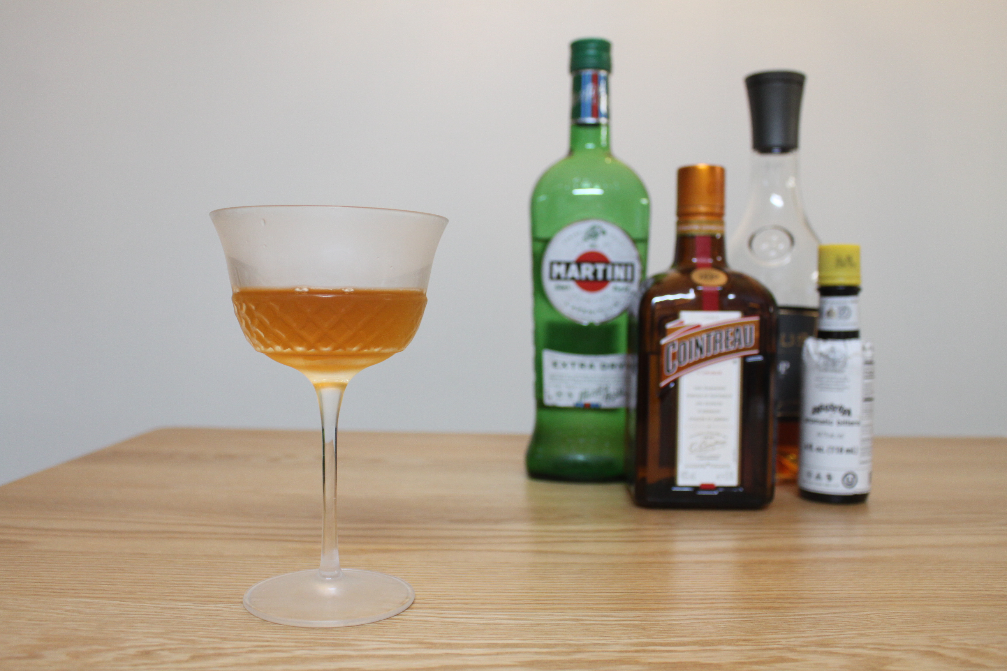 코냑(Cognac), 드라이 베르무트(Vermouth), 트리플 섹(Triple Sec)을 2:1:1/2비율로 사용하고, 아로마틱 비터스를 1대시 넣어 스터 한 후, 칵테일 글라스에 따르면 완성. 가니시 레몬 제스트는 빡시게 생략해 주었다.