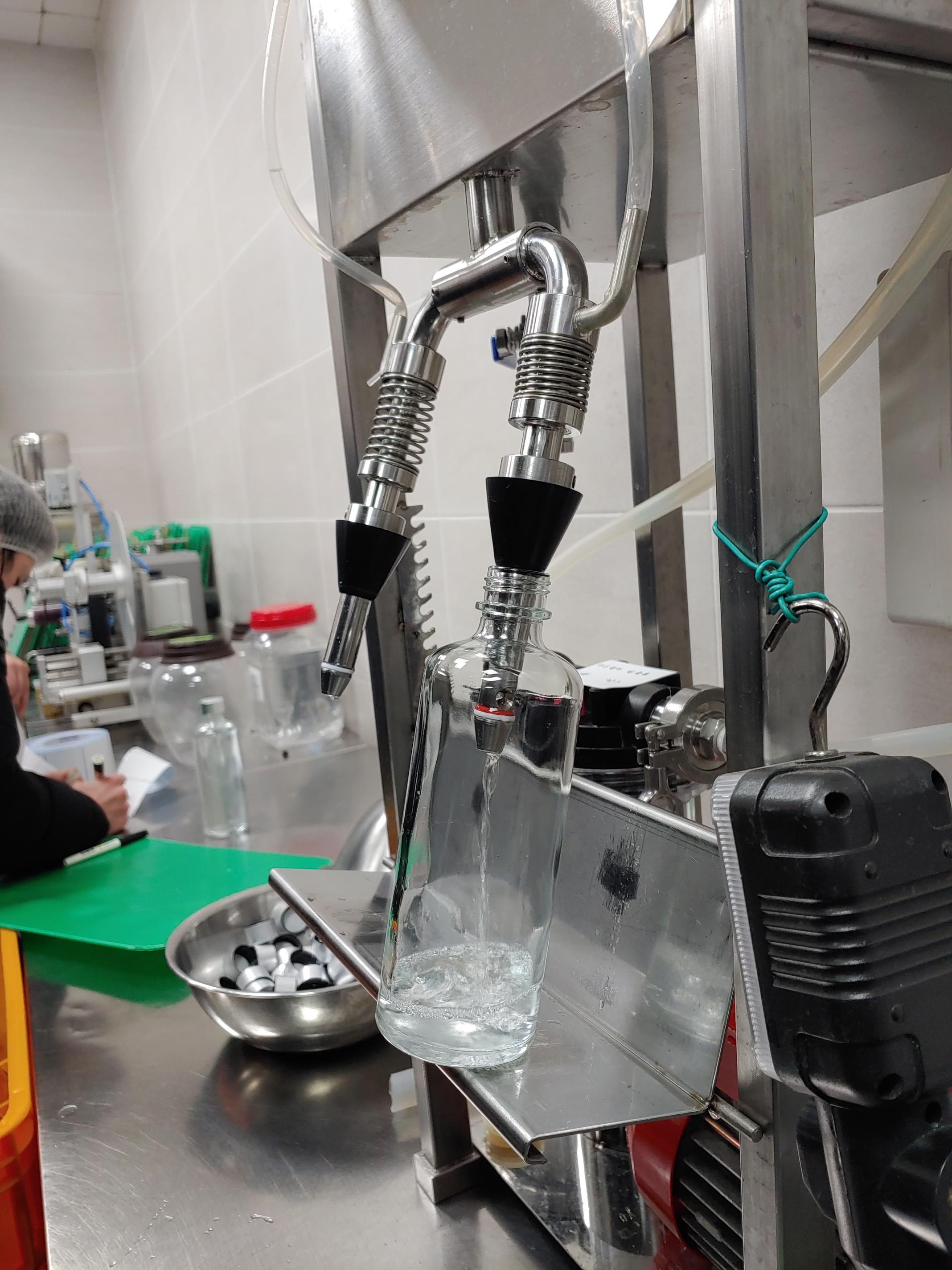 백탁이 일어난 증류주를 필터로 여과해 병입한다. 알코올 함량이 25%인 미르 25의 경우 그 상태로 냉각하면 얼어버릴 수도 있기 때문에, 40% 알코올인 상태로 칠 필터링을 진행하고, 이후 물로 희석해 병입한다.