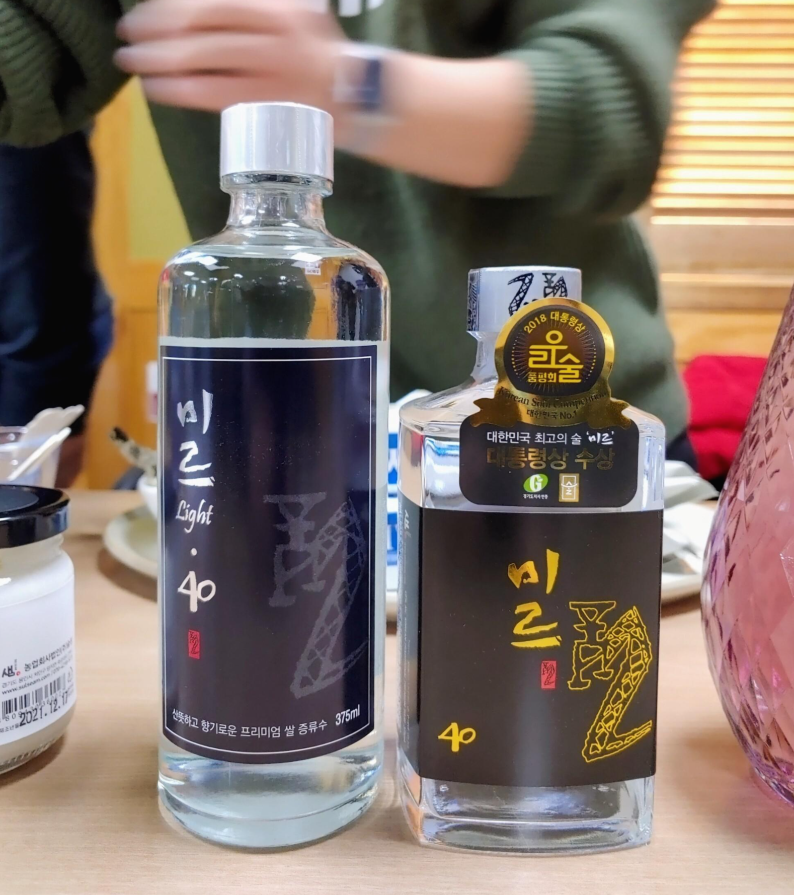 기대했던 증류식 소주, 미르. 왼쪽의 원통형은 감압식, 왼쪽의 각진 병은 상압식으로 증류한 것이다. 둘 다 알코올 도수는 40%. 상압식 소주는 2018년 우리술 품평회에서 대통령상을 받았다. 상압식 증류와 감압식 증류의 차이를 비교할 수 있는 좋은 기회다.
