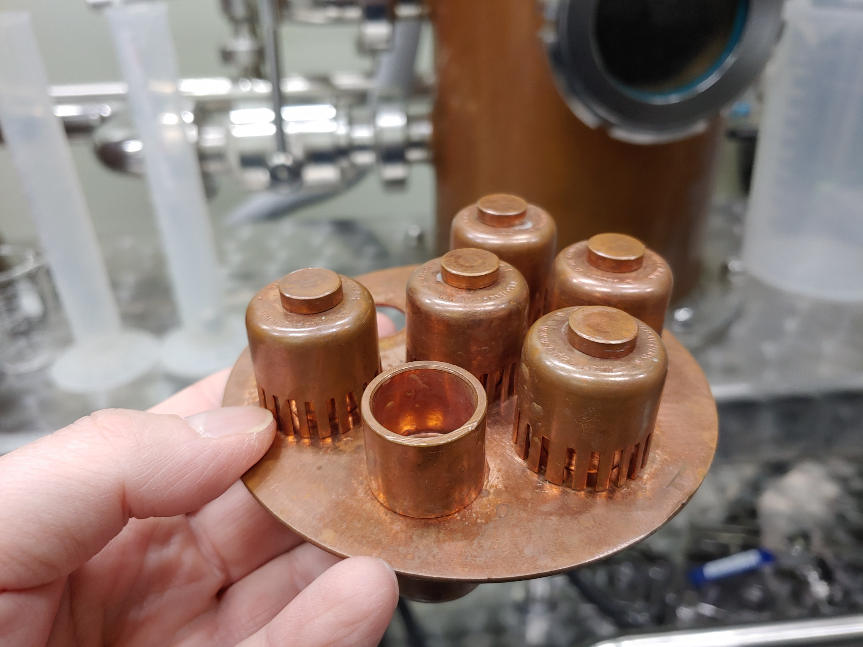 요게 바로 그 안에 들어 있는 구리판이다. 비등점이 낮은 증기가 구리 판을 통과해 계속 올라가고 일부는 환류해서 다시 아래로 떨어진다.
