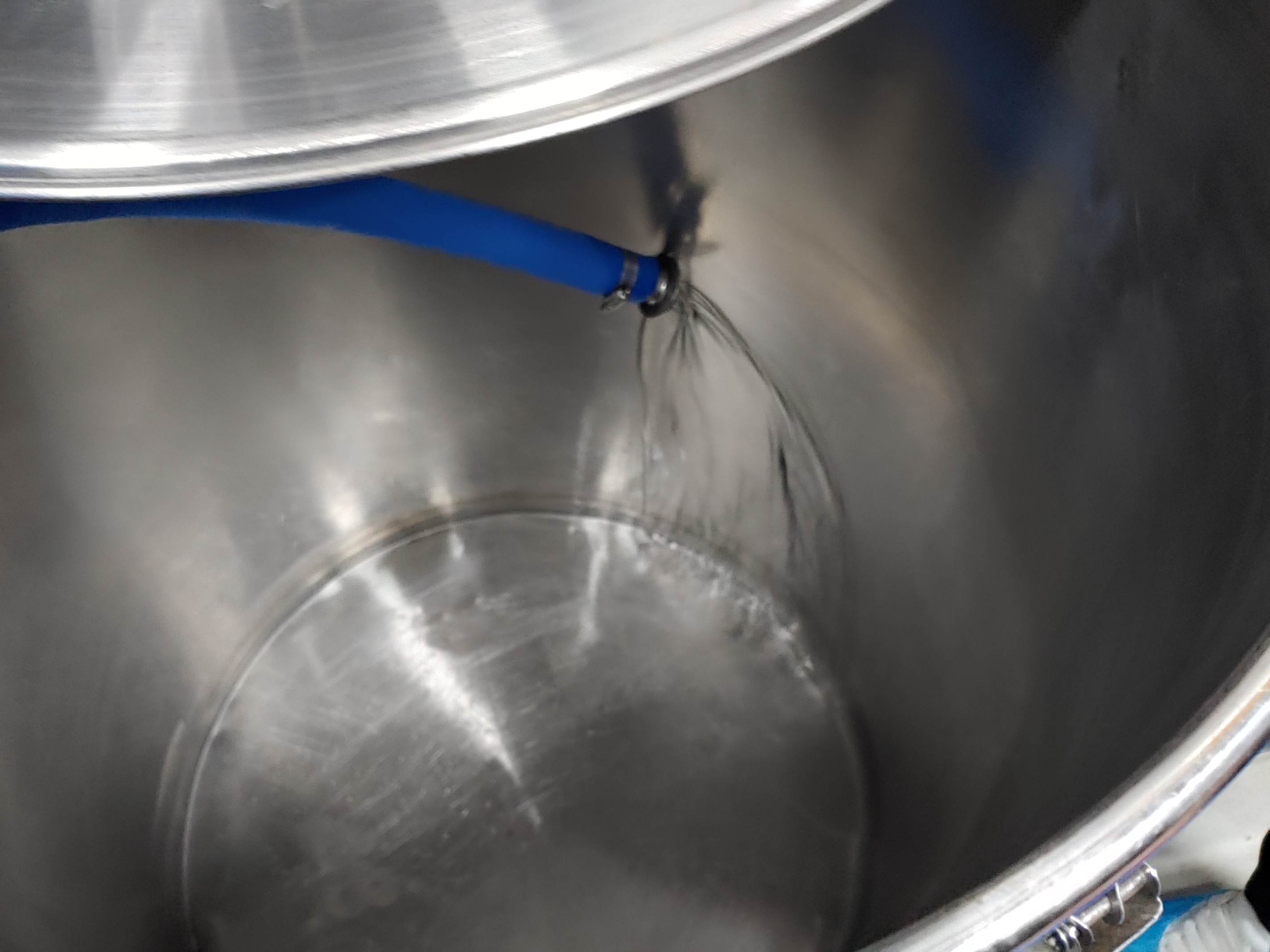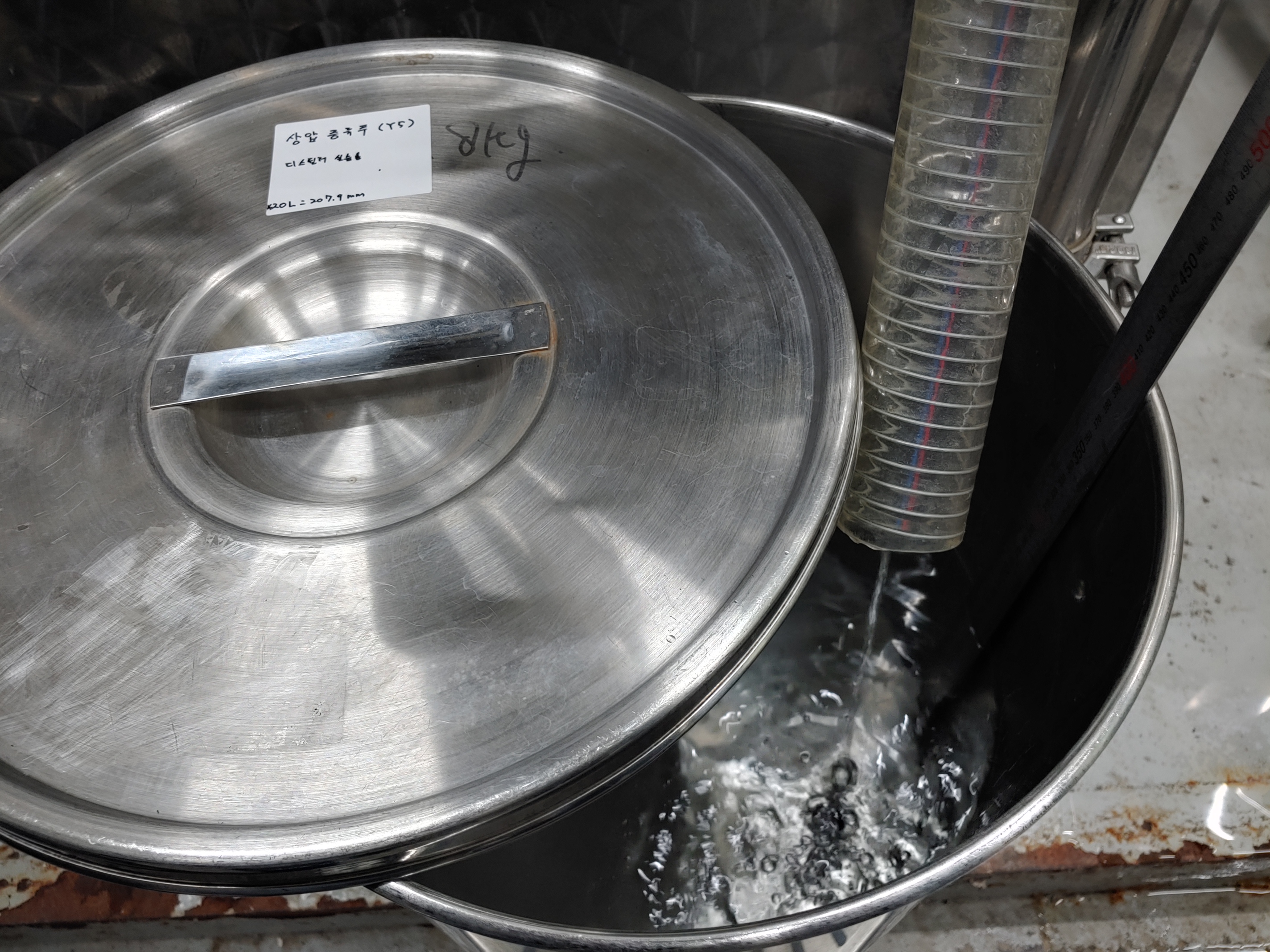 원래는 본류도 자동적으로 분류되지만, 이날은 실습을 위해 별도의 통에 20리터만 받았다. 전체 100리터를 증류했으니 20%만 받은 셈. 보통은 1/3 정도 받는다고 한다. 증류된 술이 원주 도수의 3배 정도 되는 수준.