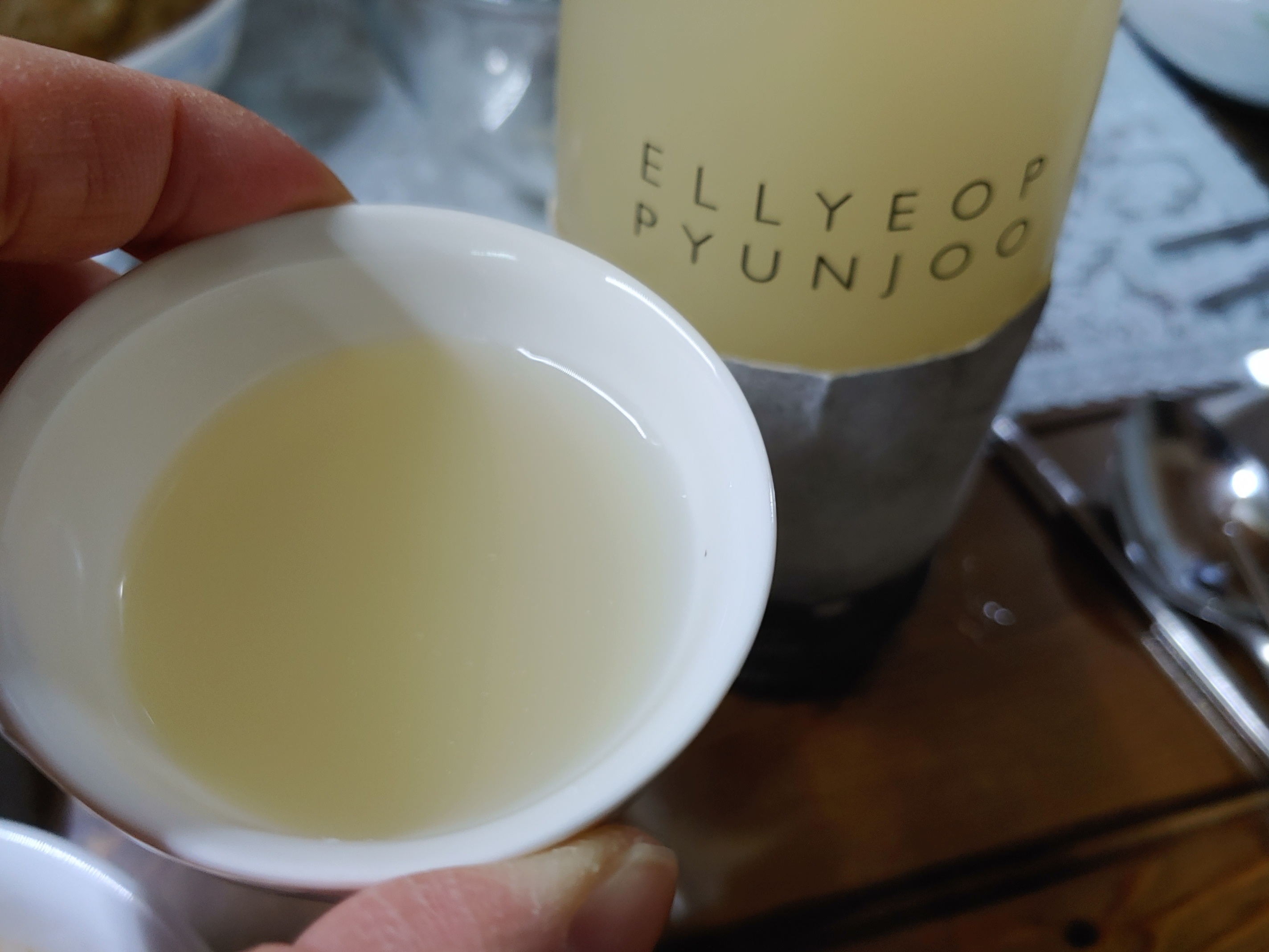 첫 잔은 흔들지 않고 웃술만 따라서 마셔 보았다. 와, 한 모금 머금는 순간 깜짝 놀랄 정도의 신맛. 물론 식초처럼 시큼한 산미가 아니라 부드러운 신맛이지만, 탁주 치고는 상당히 높은 신맛에 깜짝 놀랐다. 일엽편주 약주에 비해서도 신맛이 도드라지는 듯. 하지만 마시다 보면 그 싱그러운 신맛에 금세 적응이 되며, 특히 음식과 함께 마시면 둥글게 어우러지는 느낌에 다시 한번 놀라게 된다.