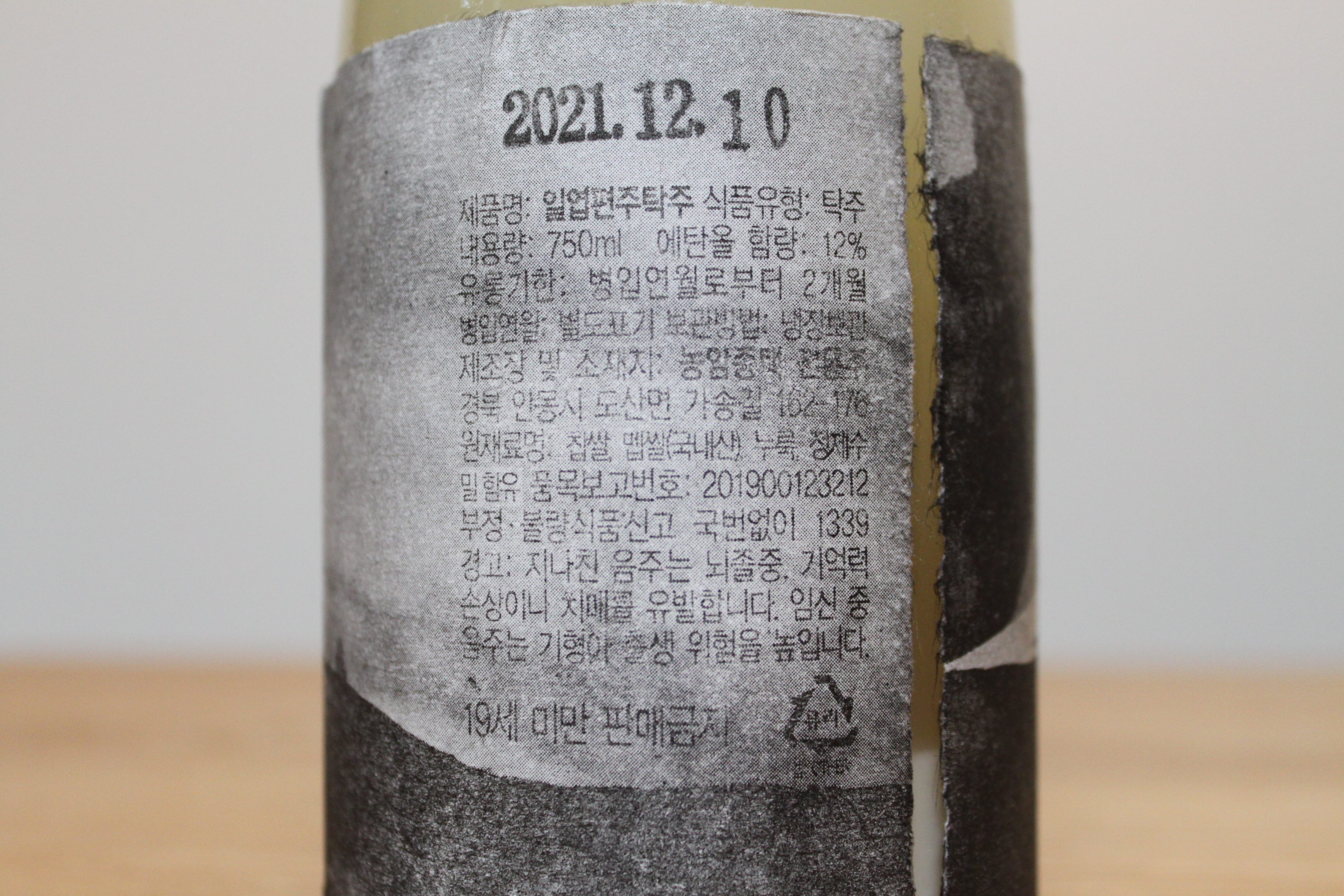 12월 10일에 병입한 술이다. 딱 2주 반 만에 마셨으니 적당히 익었을 듯. 유통기한은 2개월이지만, 취향에 따라 빨리 마시거나 더 묵혀서 마셔도 나쁘지 않을 것 같다. 재료는 안동에서 재배한 찹쌀과 멥쌀, 누룩과 정제수. 알코올 함량은 12%.