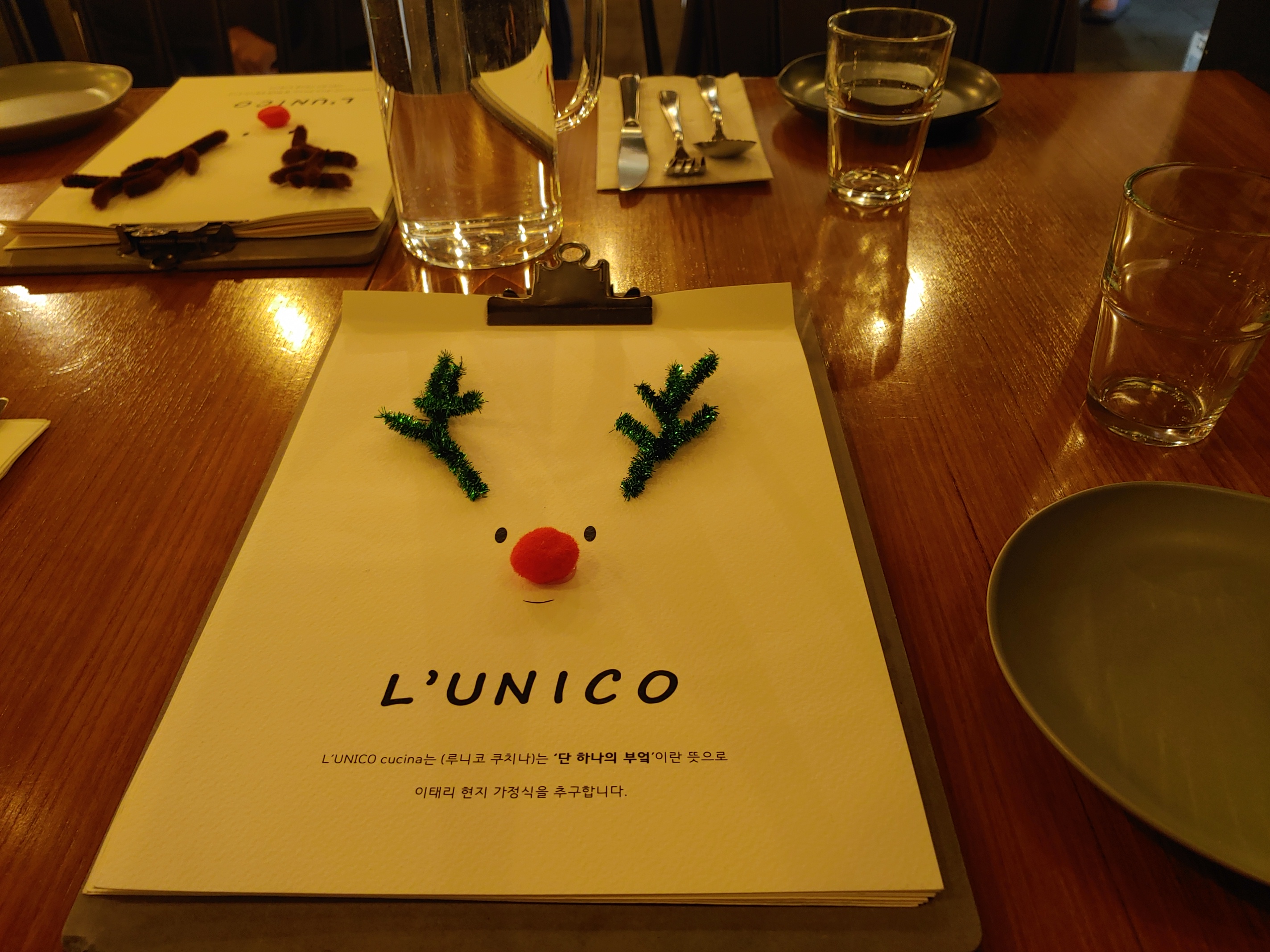 귀여운 루돌프로 장식된 메뉴판. 루니코 쿠치나는 '단 하나의 부엌'이라는 뜻이란다. 이탈리아 가정식을 추구한다는데, 정말 진짜 레알 혼또니 그랬다. 가격도 꽃등심 스테이크(300g) 4.9만을 제외하면 1~2만 원 정도로 저렴한 편이다. 안티파스티는 1~1.5만, 파스타 류는 1.5~2만 수준.