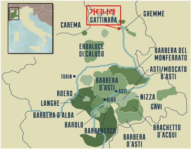가티나라(Gattinara)는 바롤로(Barolo) 북쪽으로 120km 정도 떨어진 북부 피에몬테의 작은 와인 산지다. 1967년 DOC, 1990년 DOCG가 되었다. 이웃한 겜메(Ghemme)와 함께 현지 방언으로 스판나(Spanna)라고 부르는 네비올로(Nebbiolo) 품종으로 드라이 레드 와인을 생산한다. 전체 포도밭 규모가 100ha가 되지 않을 정도로 규모는 매우 작지만, 철분이 풍부한 자갈 섞인 화산토양과 전형적인 대륙성 기후의 영향으로 네비올로 재배의 최적지 중 하나로 꼽힌다. DOCG 규정 상 포도밭은 반드시 해발 300m 이상 550m 이하에 위치해야 하기 때문에 대부분의 포도밭은 알프스 산기슭 남향 언덕의 배수가 잘 되는 토양에 자리 잡고 있다. 때문에 탄탄한 구조감과 고급스러운 아로마를 지닌 프리미엄 와인을 만들 수 있는 양질의 포도를 생산한다.