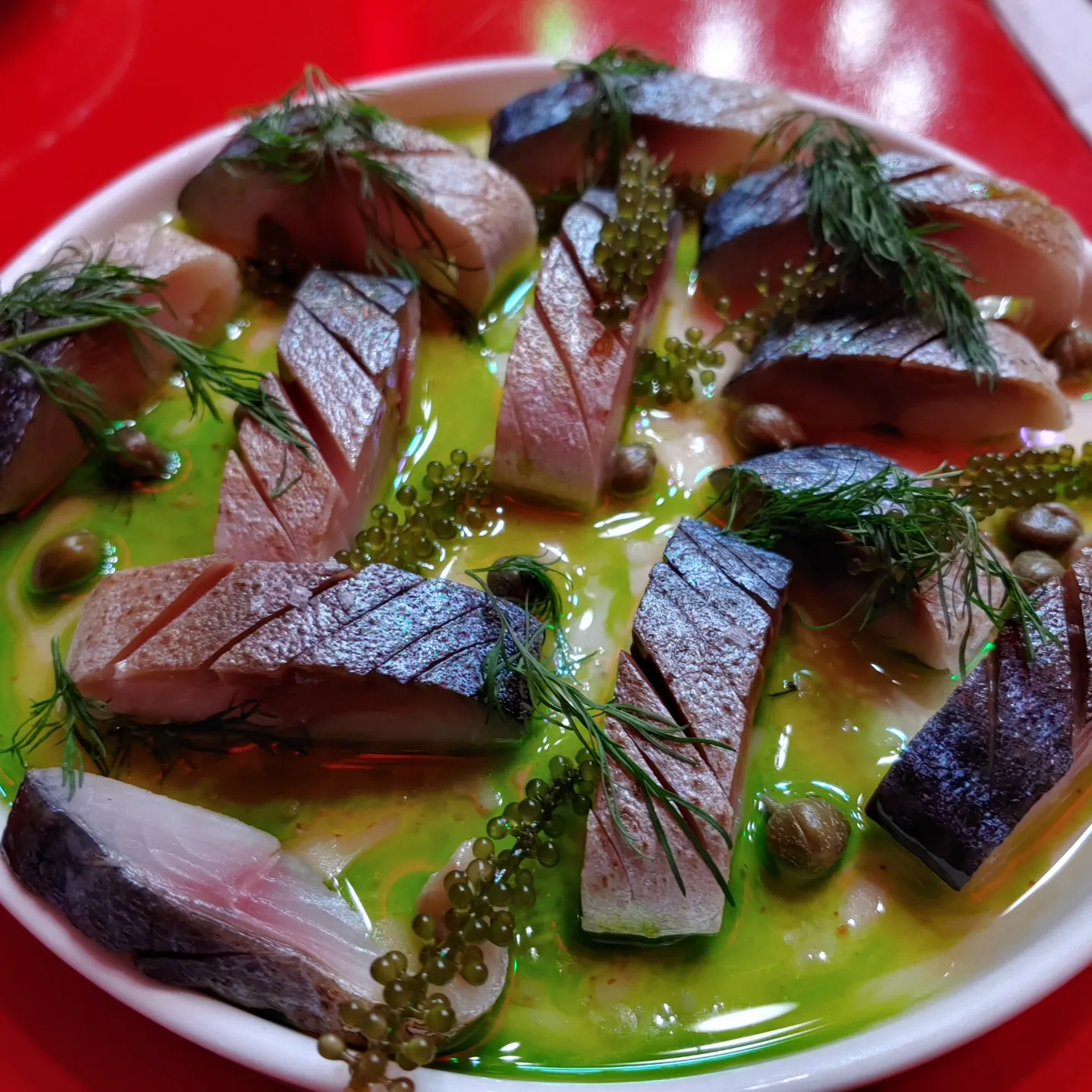 우미부도와 케이퍼, 딜을 곁들인 시메 사바. 아부리가 조금 셌고 고등어 살이 살짝 퍽퍽했지만 그래도 두 번째로 마음에 들었던 디시. 케이퍼와 우미부도를 곁들여 한 입에 먹으면 상당히 맛있었다.