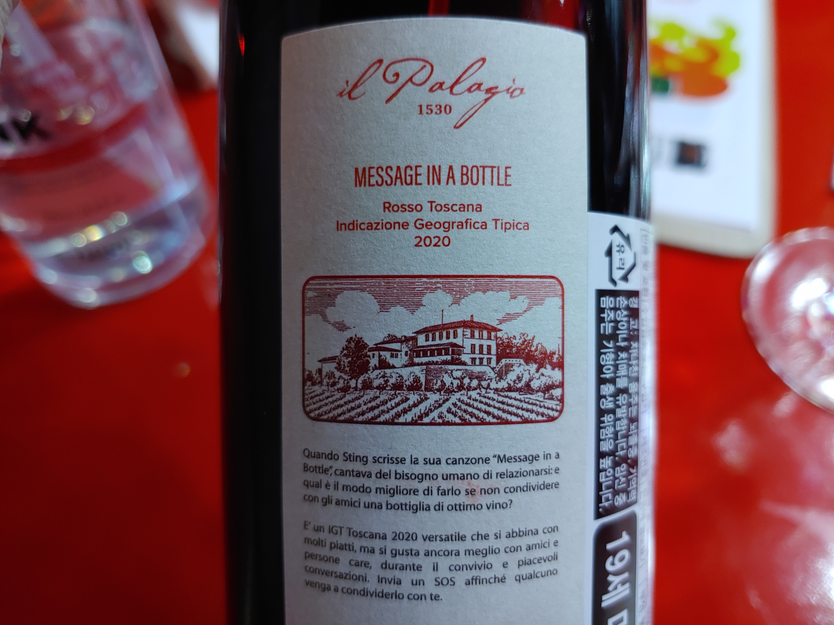 두 번째 와인은 Il Palagio, Message in a Bottle 2020 Toscana IGT. 탑 뮤지션 스팅(Sting)이 이탈리아 토스카나(Toscana)에서 그의 와이프 트루디 스타일러(Trudie Styler)와 함께 만드는 와인 중 하나다.