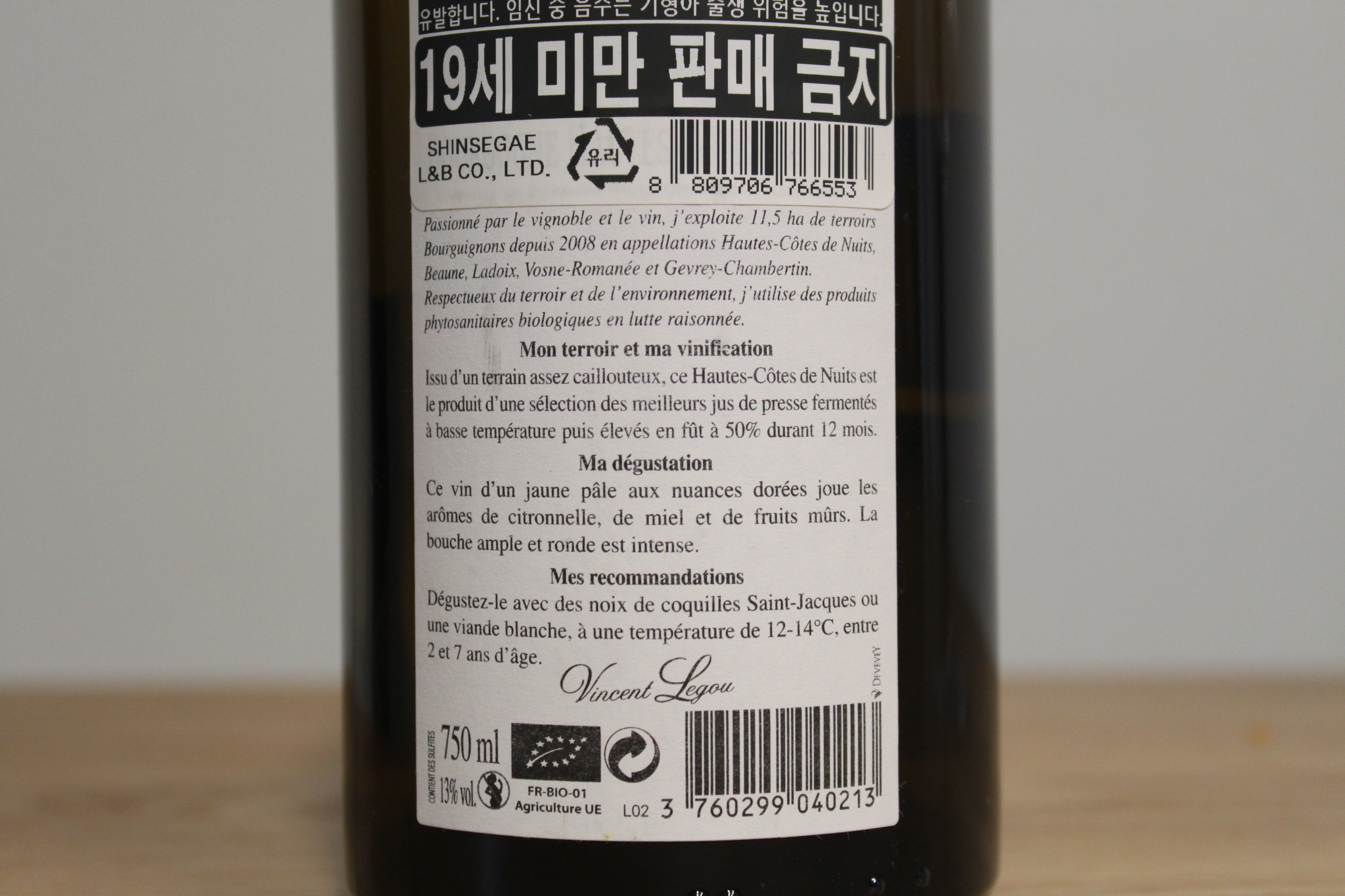 뱅상 르구 부르고뉴 오뜨 꼬뜨 드 뉘 블랑은 점토-석회암 토양의 동향 포도밭 1.97 ha에서 재배한 샤르도네로 양조한다. 포도밭은 2014년 유기농 인증을 받았으며, 살충제와 제초제를 전혀 사용하지 않는다. 손으로 수확해 건강하고 완숙한 포도만 골라 양조하며, 효모 첨가 없이 발효해 절반은 프렌치 오크(30% new)에서 12개월 숙성한다.