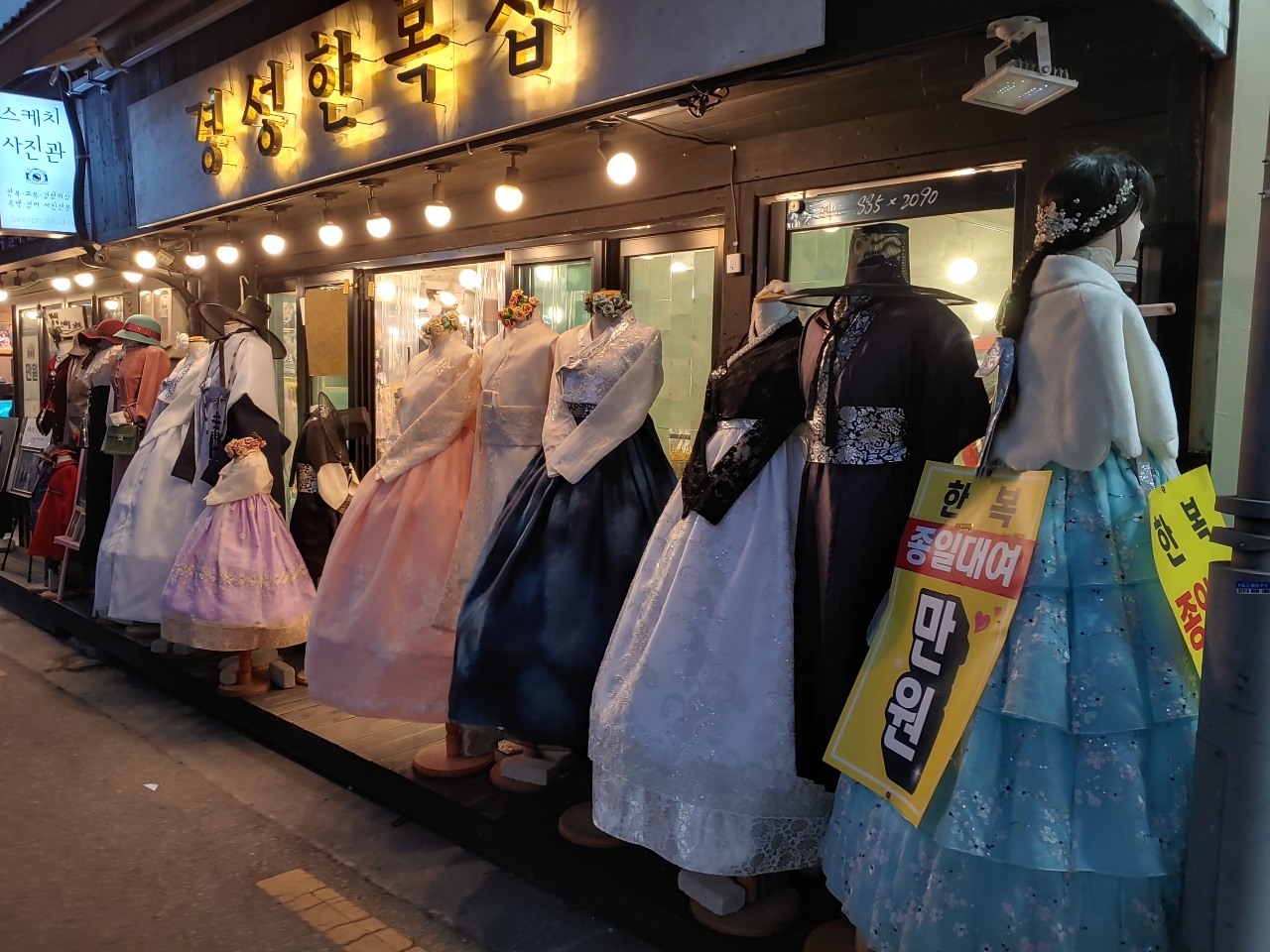 사방에 한복 대여점들 많았다. 요즘 같은 펜데믹 상황이라면 매출에 타격이 좀 있지 않을까 싶었는데, 그래도 입고 다니는 사람들이 제법 많더라는.