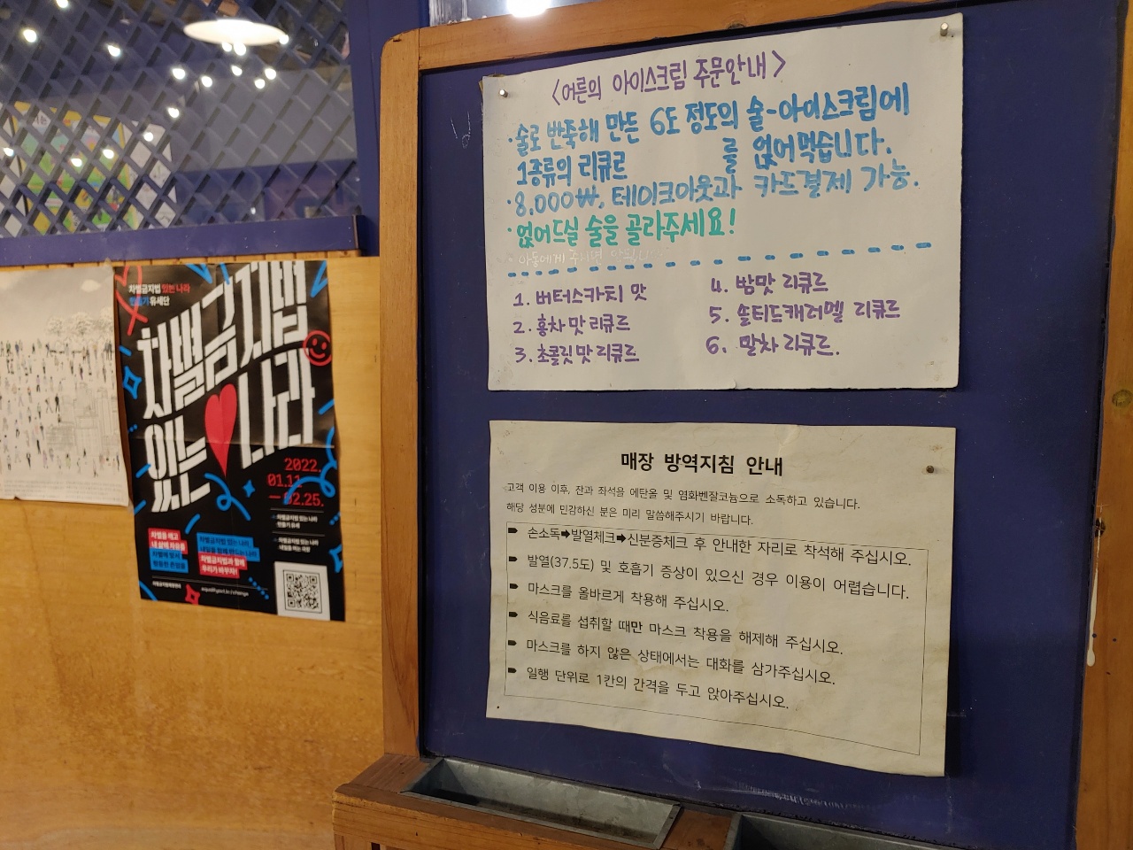 어른의 아이스크림은 버터스카치, 홍차, 초콜릿, 밤, 솔티드 캐러멜, 말차 등 원하는 리큐르를 술로 반죽해 만든 아이스크림에 얹어 먹는다. 술맛은 거의 안 날 것 같지만 그래도 약간의 취기는 얻을 수 있지 않을까.