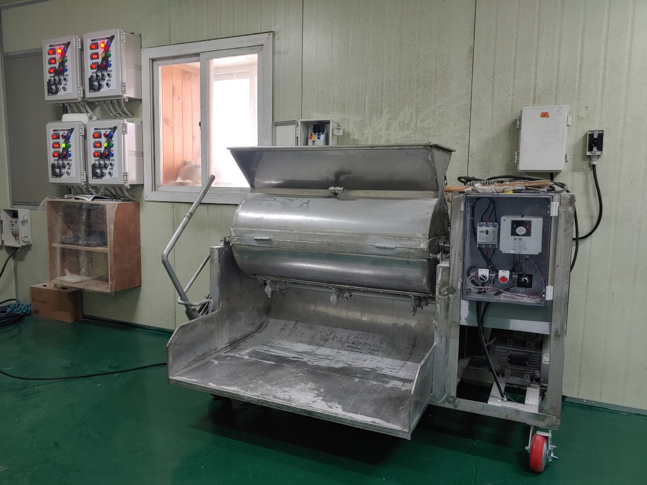 곡물 파쇄기. 왼쪽에 있는 패널들은 누룩실의 온도와 습도 등을 제어하는 것이다.