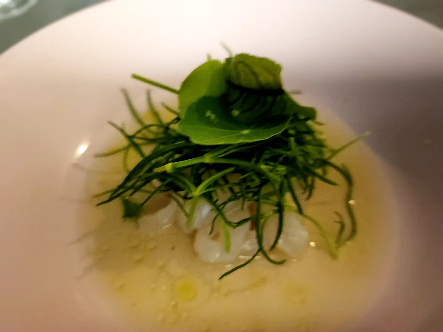 광어 카르파쵸. 아래 깔린 것은 단맛의 오이 주스, 위에 얹어진 것은 세발나물. 원래는 달래를 올리려 했는데 이런저런 이슈로 세발나물이 되었다고. 위에 올라앉은 잎사귀 모양을 보니 '개구리 왕눈이'가 떠올랐는데, 메뉴 소개에서는 모네의 '수련 연작'을 언급하고 있었다능.... 터, 털썩.
