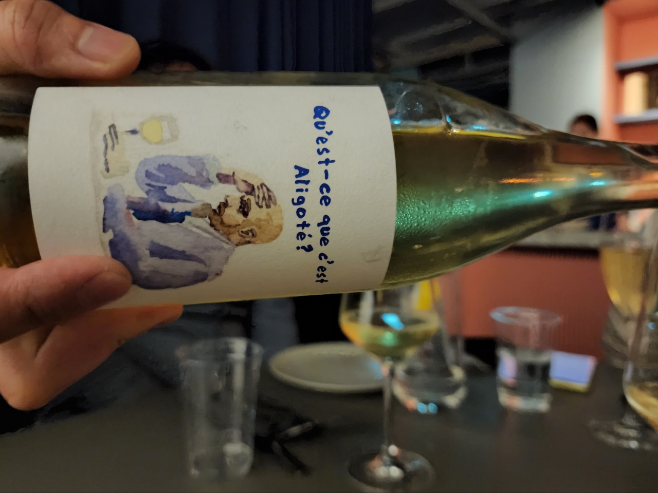 맞춰서 서빙된 술은 알리고테(Aligoté) 품종의 와인. 와인 이름인 'Qu'est-ce que c'est Aligoté?'는 '알리고테가 뭐야?'라는 뜻이다. 알리고테는 부르고뉴의 화이트 품종인데, 샤르도네(Chardonnay)보다 한 수 아래인 마이너 품종으로 취급된다. 주로 크레망(Cremant)이나 저렴한 화이트 와인을 양조할 때 사용된다. 하지만 최근엔 수준급 생산자나 내추럴 와인 생산자들이 알리고테 품종으로 흥미로운 와인들을 제법 만들고 있는데, 이 와인도 그런 것들 중 하나라고 볼 수 있겠다.