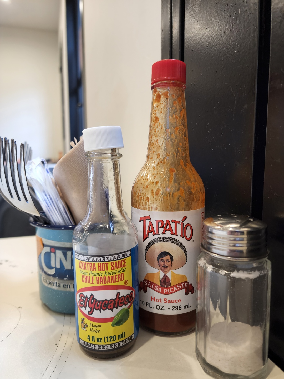 핫소스와 소금. 왼쪽의 흰 뚜껑은 하바네로 소스로 아주 맵다고. 물론 나는 손도 안 댔다.