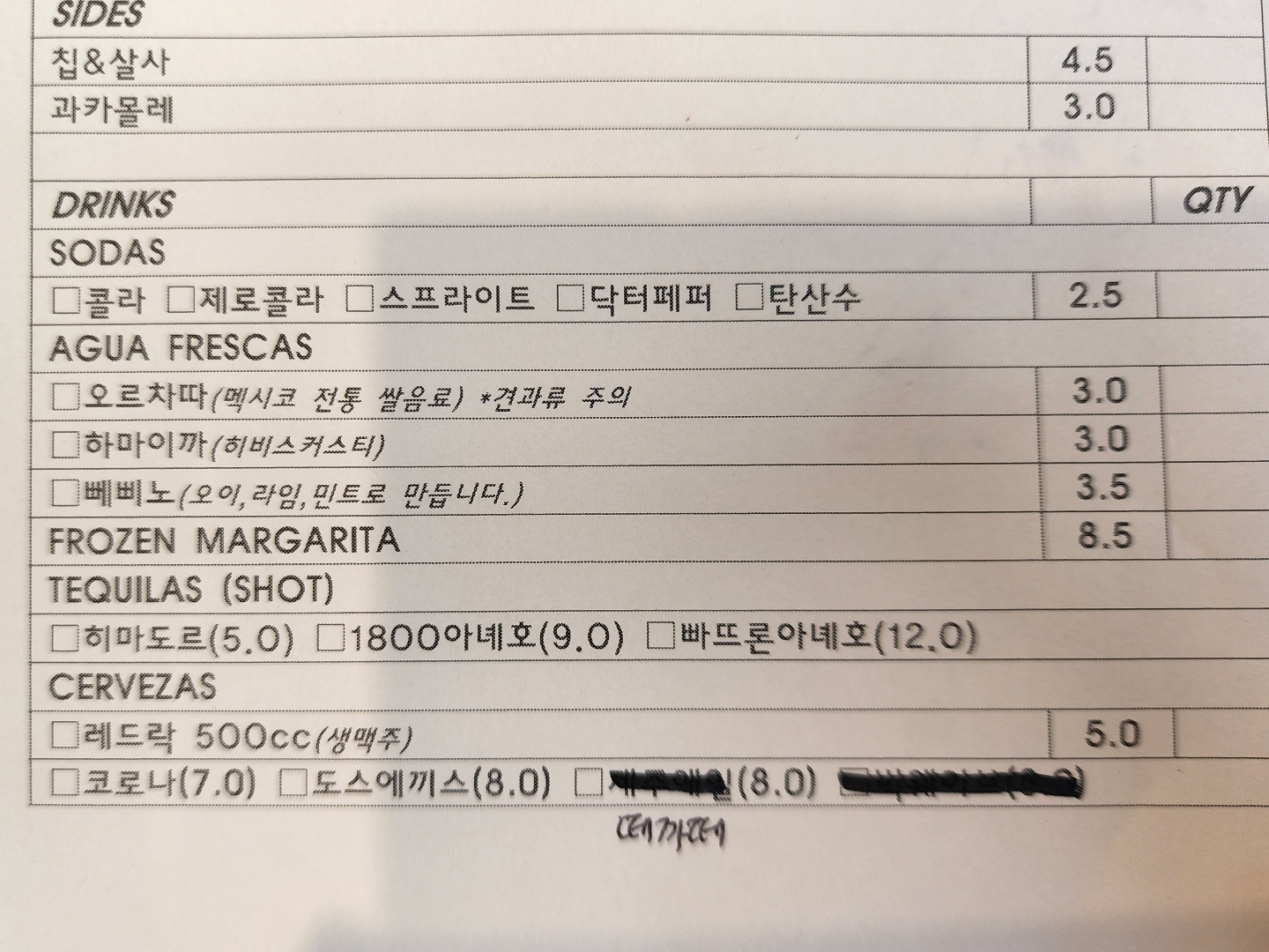 음료는 탄산음료 외에 오르차따, 하마이까, 뻬삐노 같은 멕시코 전통 음료가 있다. 오르차따는 딱 아침햇살 맛이라고 해서 주문할 생각이 없었고, 뻬삐노를 시켜볼까 하다가... 그냥 안전하게 닥터 페퍼로.