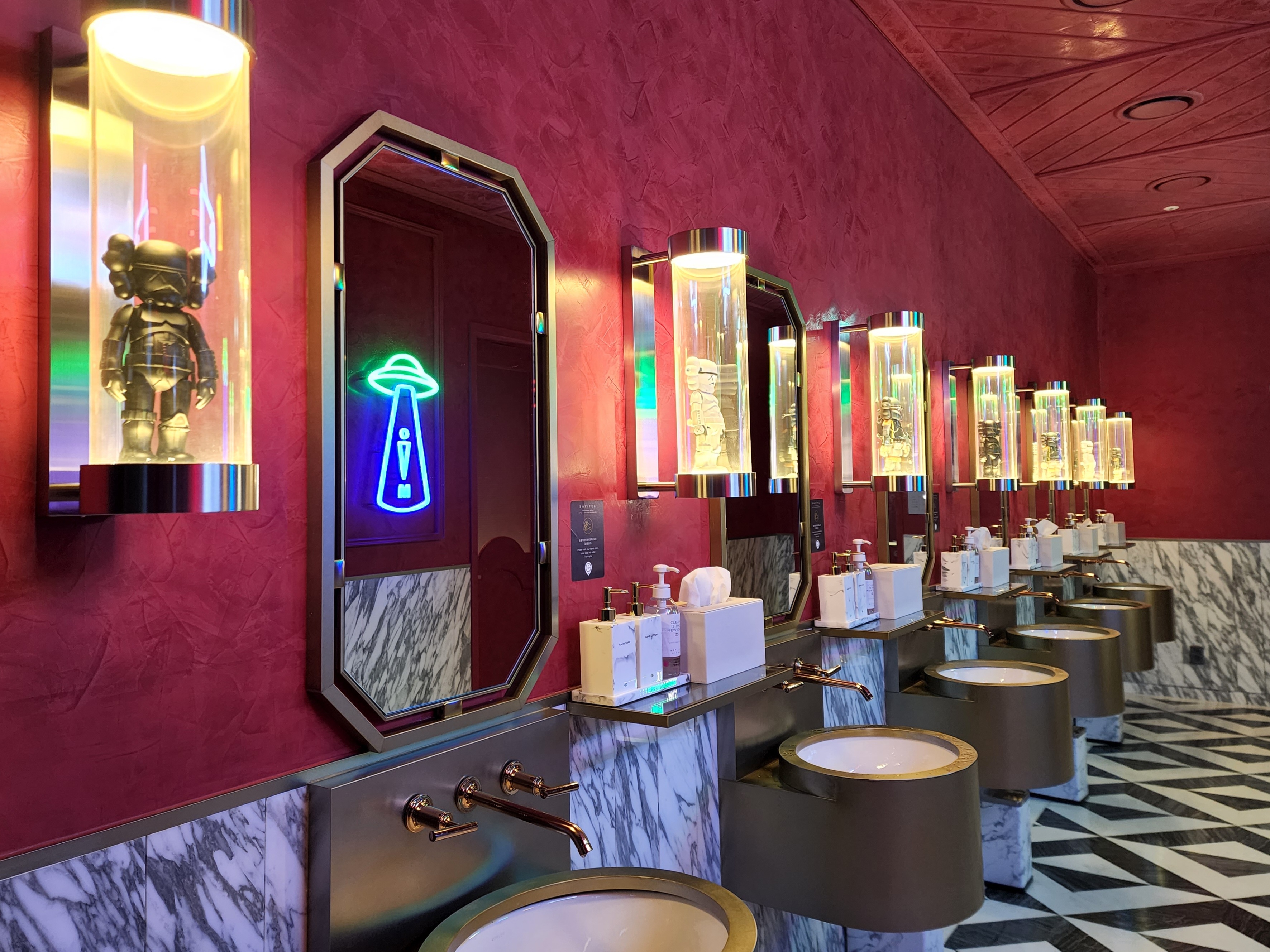 여기 화장실도 아주 멋지다. 우주 컨셉에 잘 맞는 모던한 느낌.