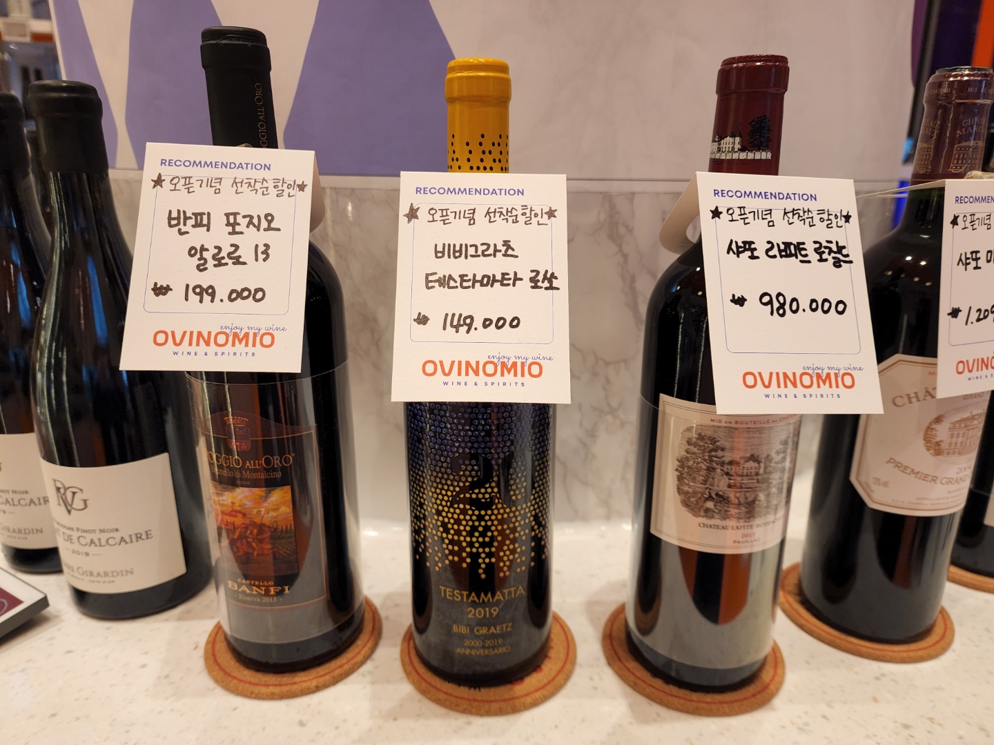 요건 예전에 와인북카페에서 맛있게 마셔서 기억에 남아있는 와인들인데 진열돼 있어서 반가운 마음에 찍어 보았다. 왼쪽은 마이와인즈, 오른쪽은 비노쿠스에서 수입하는 와인들이다.