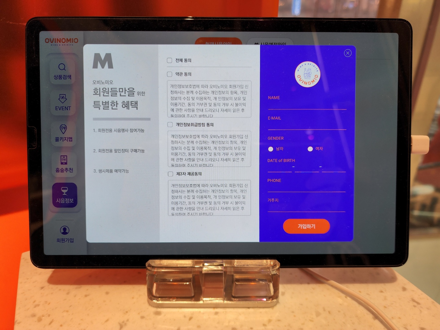 회원가입은 매장에 비치된 태블릿으로 쉽게 할 수 있다. 요 태블릿으로 용산 부근 콜키지 협약을 맺은 음식점들도 검색할 수 있다. 오비노미오에서 와인을 구입하고 받은 쿠폰을 가져가서 콜키지 프리, 혹은 소정의 콜키지를 내고 즐길 수 있다고.