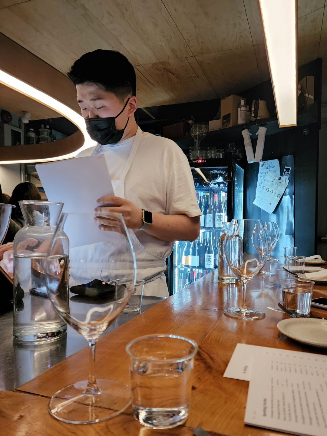 메뉴판. 맨 위에는 예약자인 친구의 이름이 적혀 있었다. 메뉴를 상황에 맞게 바꾼다는 의미이기도 하고, 손님 하나하나를 존중한다는 의미도 있어서 여려 모로 기분이 좋다. 주문한 모든 음식이 다 개성 있고 맛있었는데, 양이 적기 때문에 여럿이 가면 하나씩 다 먹어보게 될 것 같다.