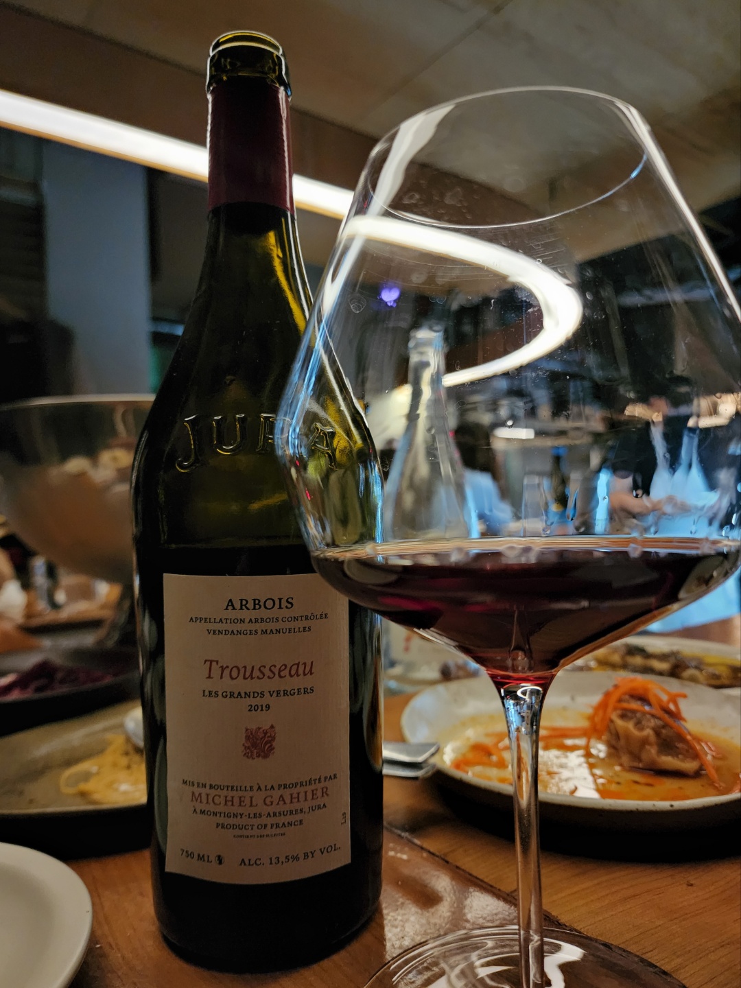 위에서 잠깐 언급한 대로 70년 수령의 그랑 베르제 포도밭의 트루소로 만든 와인이다. 처음엔 약간의 환원취와 함께, 살짝 거슬리는 쥐똥내-_-가 드러나는데, 천천히 스월링을 하며 걷어내고 나면 예쁜 붉은 꽃과 석고 같은 미네랄이 하늘하늘 예쁘게 드러난다. 블랙커런트와 붉은 자두 풍미가 섬세하게 드러나며, 완숙한 작은 붉은 베리와 체리 아로마가 싱그러운 신맛과 어우러져 수줍게 매력을 뽐낸다. 바디는 가볍고 타닌도 쫀쫀하지만 많지 않아 부담스럽지 않다. 부르고뉴 보졸레 쥐라... 요 쪽 좋아하는 사람이라면 좋아할 수밖에 없는 와인.