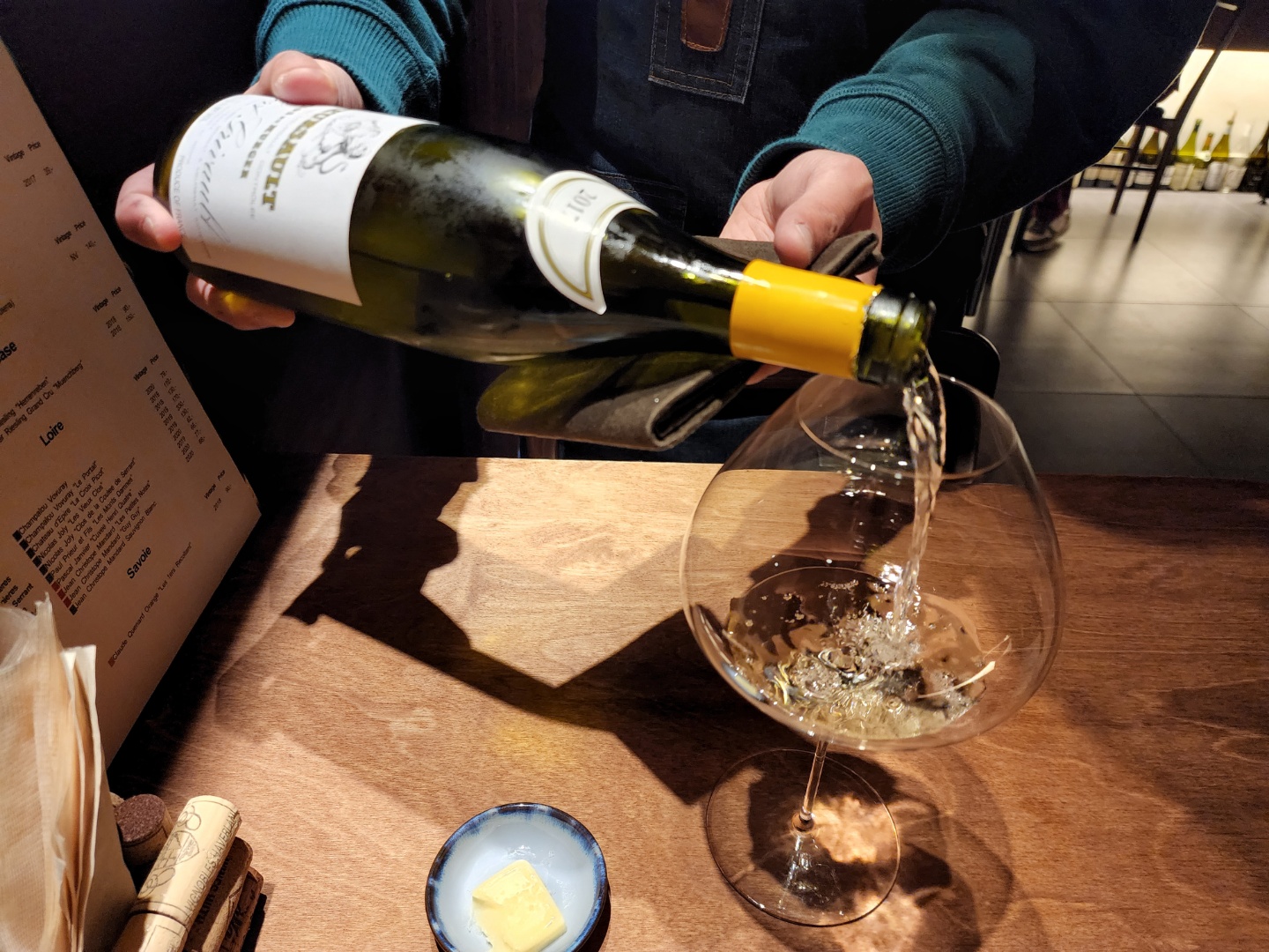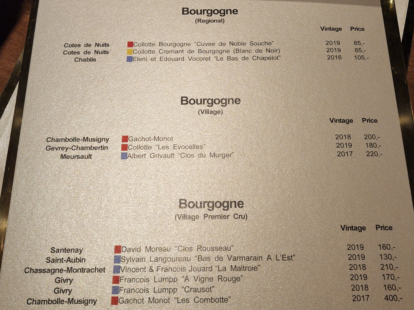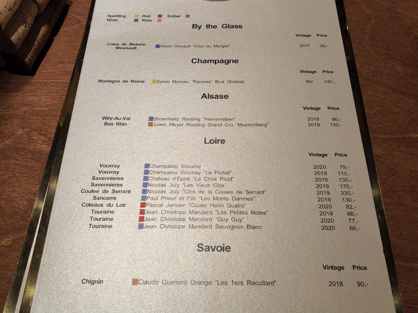 와인 리스트. 글라스 와인으로 뫼르소(Meursault)를 사용하는 게 특이했는데, 생각해 보니 가게 이름과도 연결되는 것이 나름 센스 있는 선택이었다. 낯익은 생산자와 모르는 생산자가 섞여 있었는데, 소매점에서는 찾아보기 힘든 레스토랑용 와인들로만 구성돼 있다.