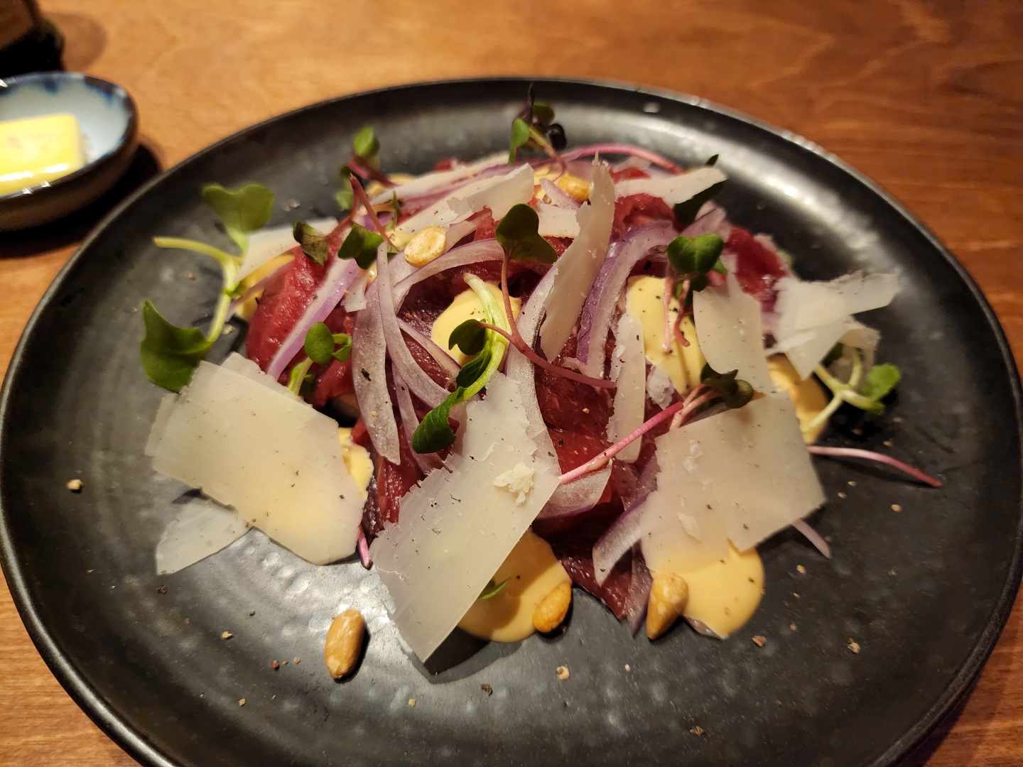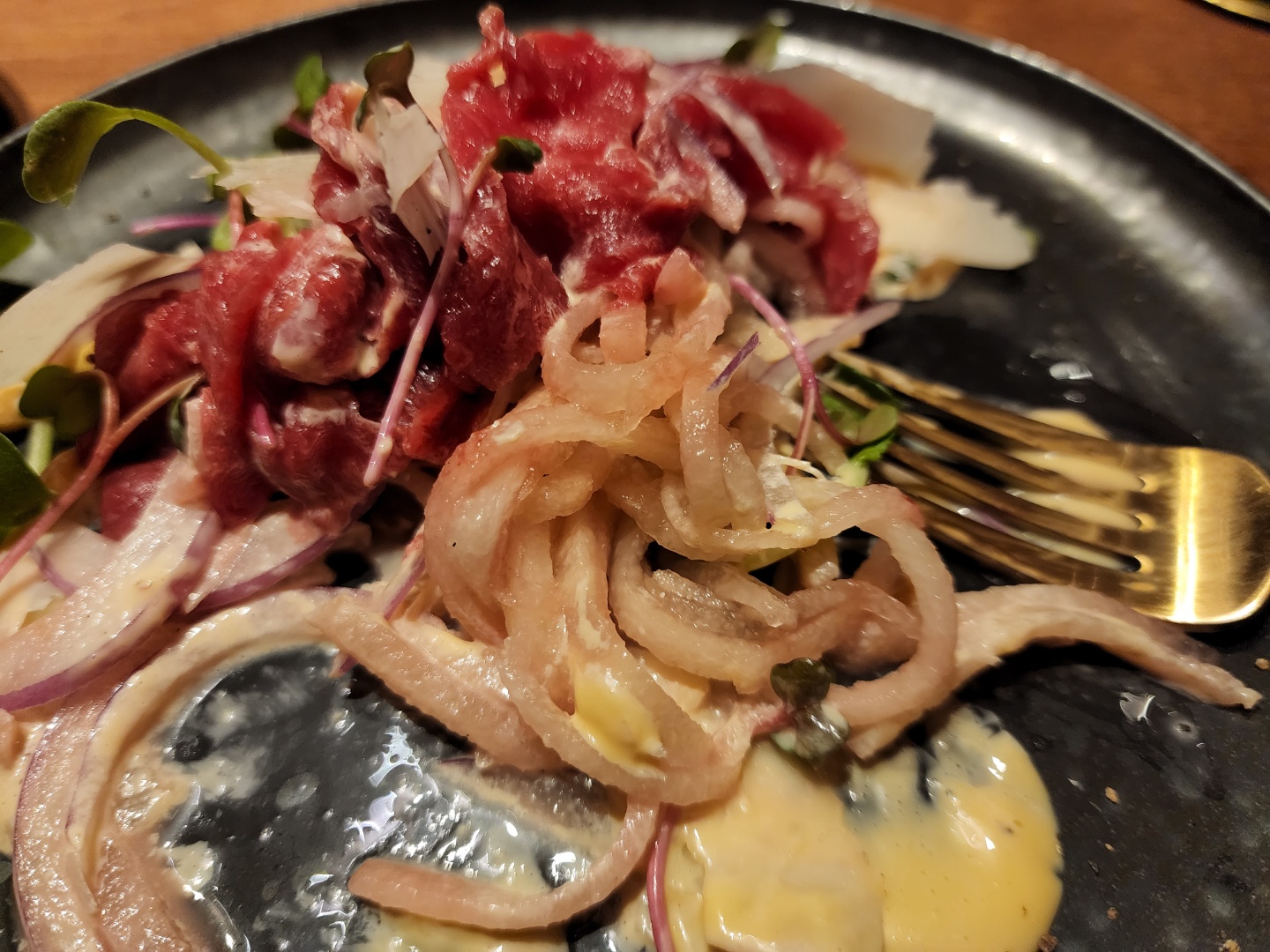 서양식 말고기 육회. 와인식초와 딜에 절인 배가 바닥에 깔려 있고, 간장 아이올리 소스와 파르미지아노 레지아노 치즈, 잣을 곁들였다.