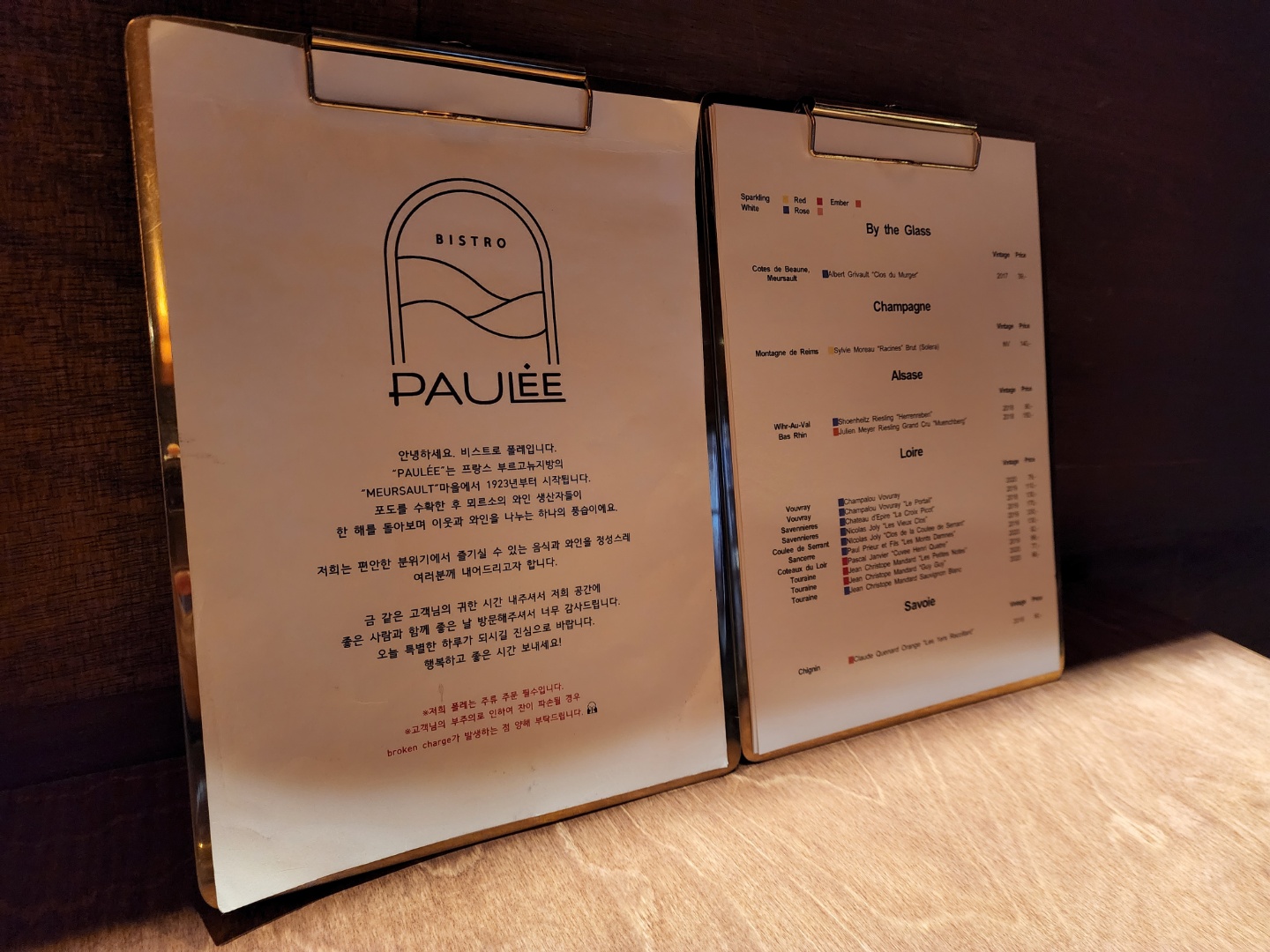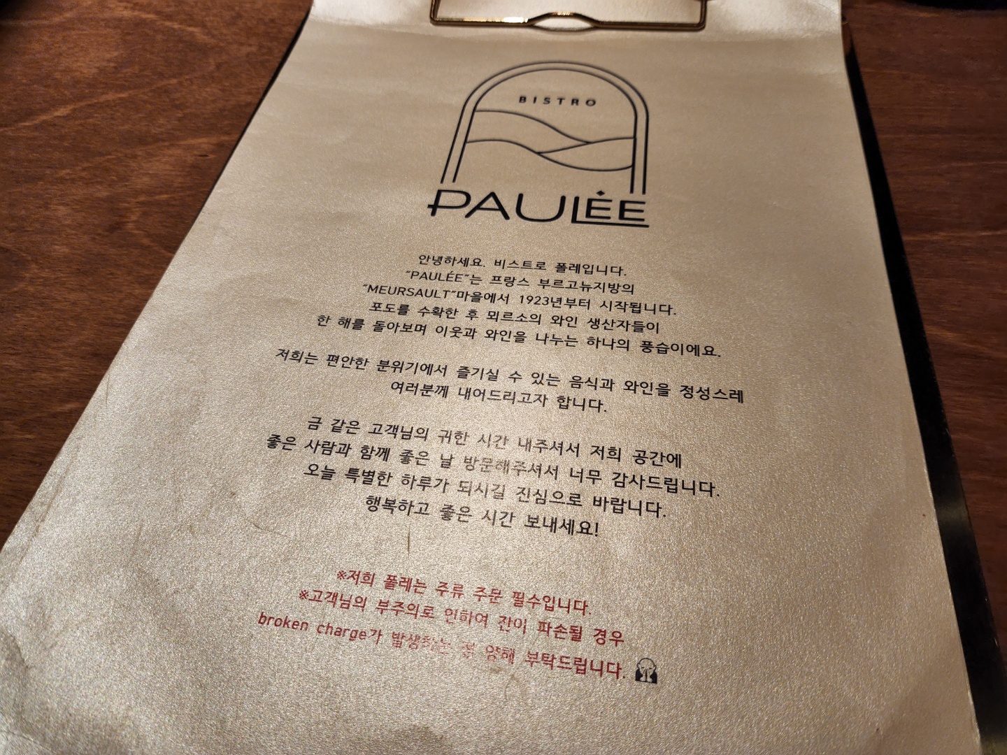 가게 이름인 폴레에 대한 설명이 적혀 있다. 와인바이므로 주류 주문은 필수다. 와인 반입도 허용은 되나 콜키지가 5만 원이다. 한 마디로 꼭 마시고 싶은 기념 와인이 아니라면 들고 오지 말라는 얘기. 그래도 완전 금지가 아니라 이런 식으로 반입을 허용한다는 건 나름 유도리 있게 운영하신다는 의미인데, 경험을 해 보니 실제로 그랬다. 젊은 소믈리에님이 조근조근 설명도 잘해 주시고, 와인에 대한 열정도 넘쳐 보였달까.