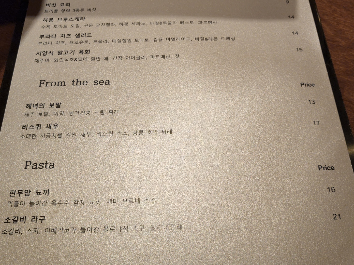 와인 리스트에서 조금 아쉬웠던 건 글라스 와인을 레드, 화이트로 1~2종씩은 갖췄으면 어땠을까 싶다는 것. 또한 혼자 온 고객이나 다양한 와인을 즐기고 싶은 고객을 위해 하프 보틀 리스트를 만들거나 글라스 페어링 코스를 운영하면 좋을 것 같다. 물론 글라스 와인을 운영하려면 고객 수에 따른 리스크를 감수해야 하는 문제가 있지만, 주말에만 운영한다던지 하는 식으로 리스크를 줄일 수도 있지 않을까.
