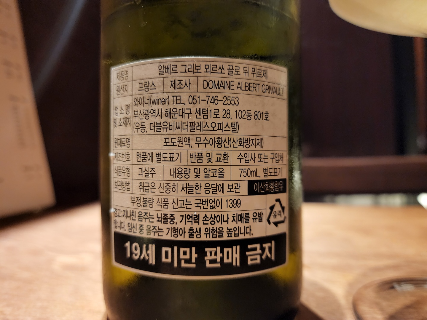 화이트도 한 잔 시킬까 고민하고 있는데 갑자기 와인을 가지고 오셨다. 글라스로 파는 뫼르소를 한 잔 서비스로 주시겠다는 것. 감사하게도 귀한 와인을...