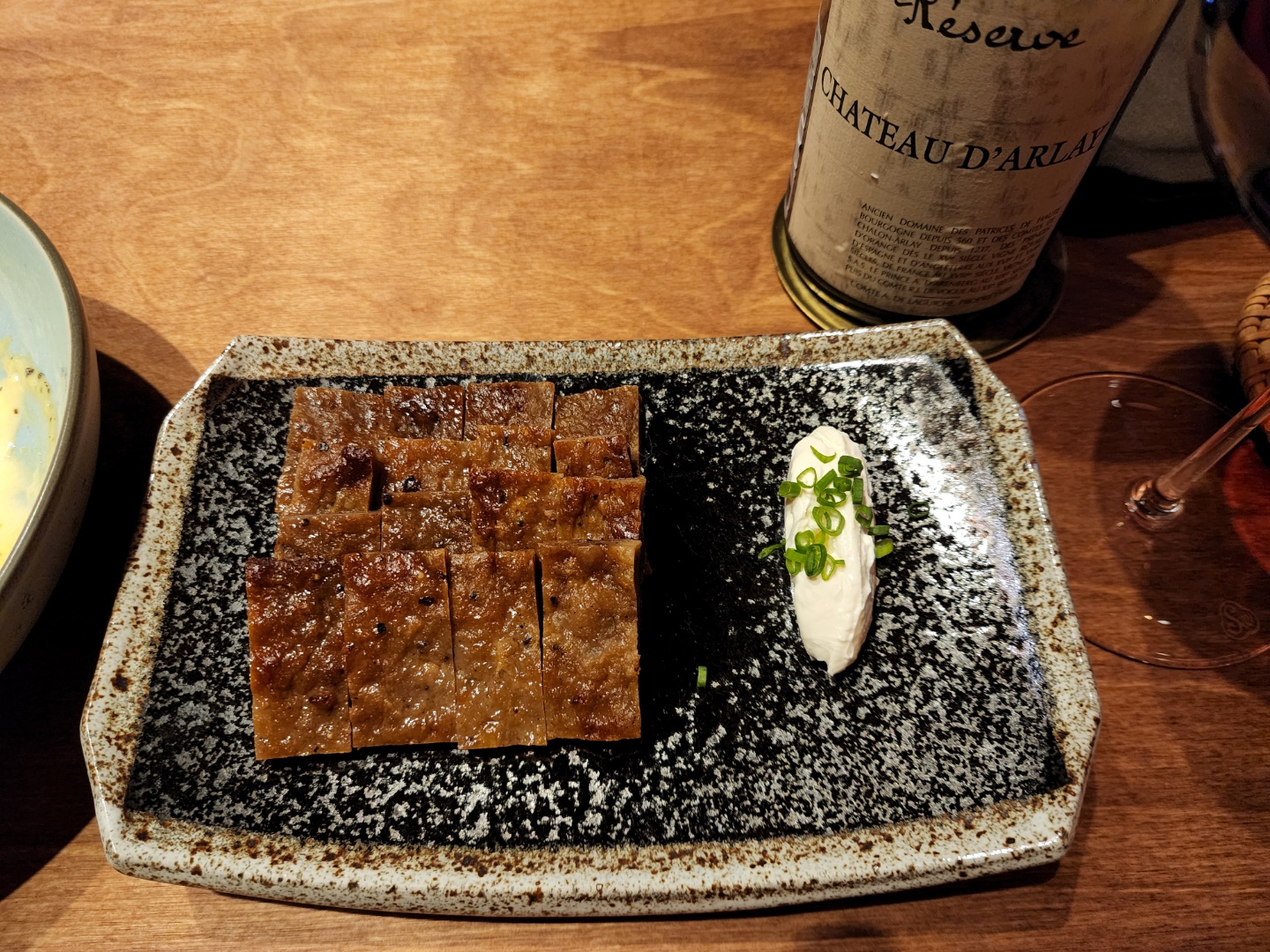제주산 흑돼지 육포. 생각했던 스타일이랑은 좀 다른데, 소믈리에님이 일반적인 육포 스타일이 아니라고 미리 말씀해 주셨다. 내 스타일은 아니지만, 외려 안주가 부족할 때 시키기엔 여러 모로 좋은 아이템이다. 양도 많고 가격도 저렴하고.